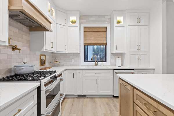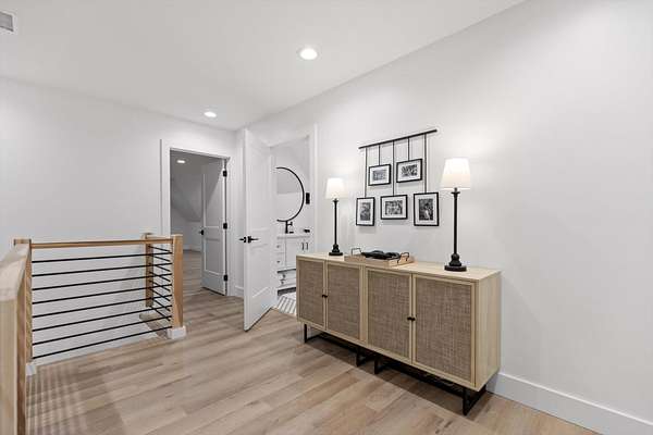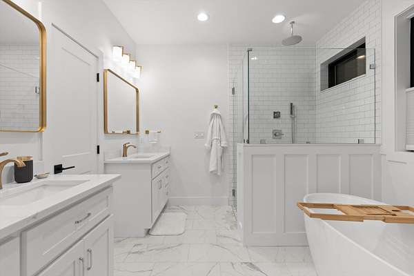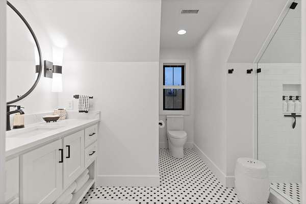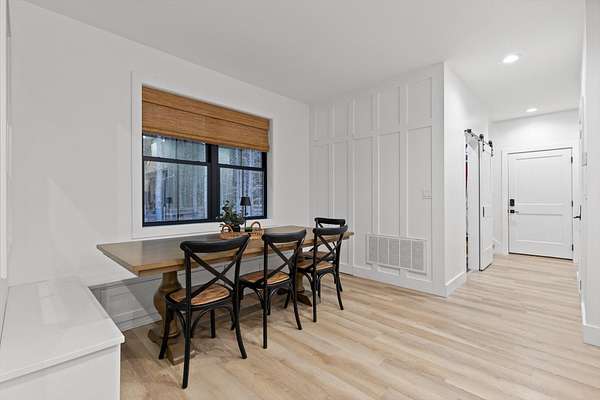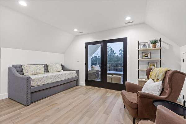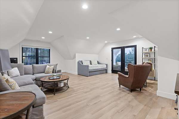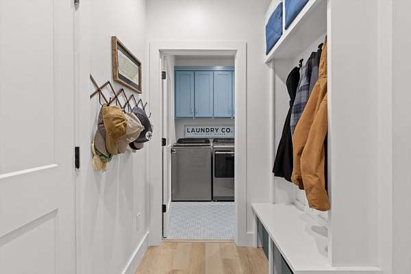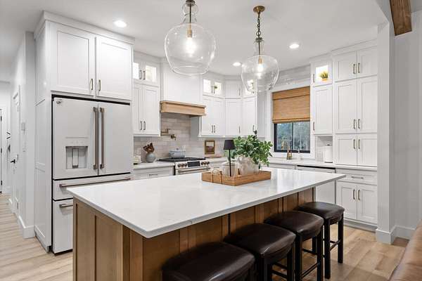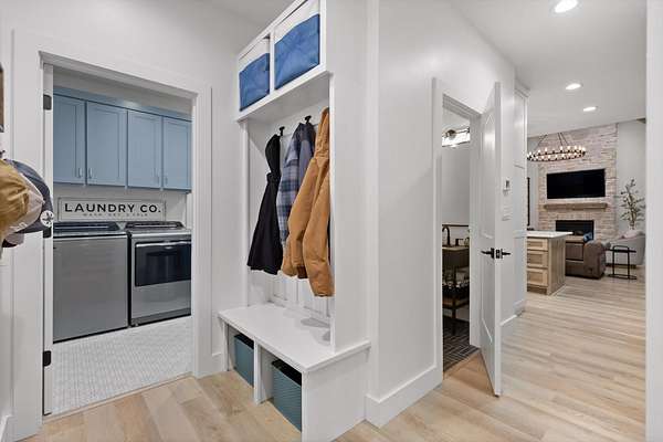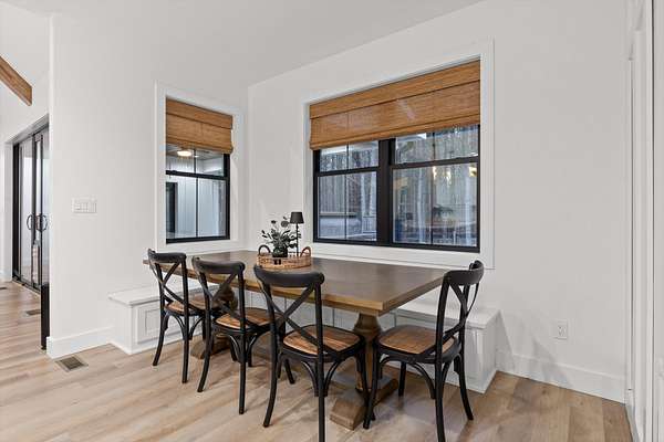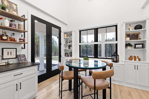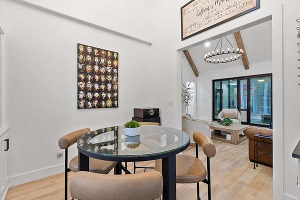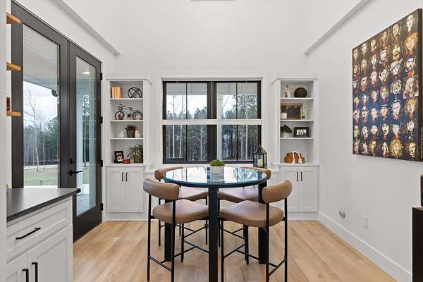 Back in the living room, a charming breakfast room with custom built-ins and porch access flows into the designer kitchen featuring high-end appliances, walk-in pantry, pot filler, abundant cabinetry, and a counter-height island with bar seating, along with additional dining space with a built-in booth. Nearby, pantry storage, a stylish laundry room, and half bath enhance the home's functional layout. The main-level primary suite offers a spacious walk-in closet and spa-like bath with soaking tub, dual vanities, and separate tiled shower, while two additional bedrooms share a full hall bath. Upstairs, an additional bedroom, full bath, and generous flex or bonus room open to a stunning porch, providing versatile space for guests, work, or recreation.