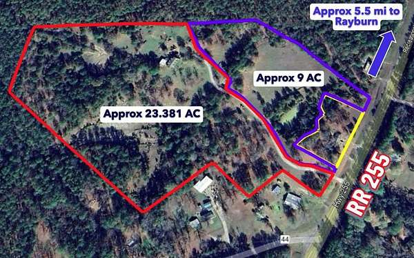 Just five minutes from beautiful Lake Sam Rayburn, this spacious property offers both room to roam and room to relax! Set on approx 23.381 rolling acres with a scenic creek flowing over natural rock, the land is as inviting as the home itself. The two-story residence features 8 bedrooms, 3 baths, and generous living space for everyone to spread out. The main level includes a large living room with a wood-burning fireplace, a primary suite with walk-in closet and private bath featuring a tiled walk-in shower, plus three additional bedrooms. Upstairs, a versatile second-floor area offers 4 more bedrooms, a full bath, and space that could serve as a game room, guest quarters, or second living area. There's even a spot prepped for a kitchenette--perfect for creating 2 separate living spaces. Seller is offering $25,000 buyer credit for improvements with acceptable offer. There's also approx 9 additional acres available for purchase separately.