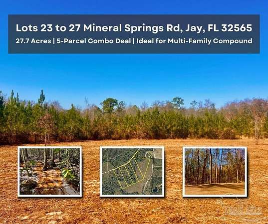 5-PARCEL COMBO DEAL - 27.7 AC - IDEAL FOR MULTI-FAMILY COMPOUND - PAVED RD FRONTAGE - GREAT PRIVACY!!! Five beautiful parcels for sale on Mineral Springs Rd. This property consisting of FOUR 5-ACRE LOTS & ONE 7-ACRE LOT allows 5 residences and additional outbuildings. All lots have paved road frontage. There is a crushed asphalt road installed on 7-AC Lot 27 that will take you from the paved Mineral Springs Rd inside the lot, to about 1-AC clearing at the top of the hill. This private clearing has beautiful views and is surrounded by hardwoods at the south side of the lot. This property offers a variety of landscapes and vegetation. From forest trails and pine tree forrest to hardwoods including the variety of Oaks and Magnolia Trees. There is a stream/creek flowing across the whole property. WELCOME TO MINERAL SPRINGS. Mineral Springs Rd land development is located away from the city traffic and hassle, yet the community is only 25 minutes away from Five Points in Pace, FL. The Mineral Springs area provides high elevations and stunning views of Escambia River Valley. The future residents will be able to enjoy the serene and private feel of this charming section of Santa Rosa County countryside. This new community is situated only 5 minutes from Escambia River and Chumuckla Springs Boat Ramp (on the east side) and about 5 minutes from Chumuckla Hwy and Hwy 178 (on the west side). Mineral Springs Rd lots are located only 25 to 30 minutes away from the convenience of Pace shopping and local restaurants and about 45 minutes from Downtown Pensacola. This land development is situated about an 1 hour and 15 minutes away from The Gulf of Mexico including popular beach resort communities such as Pensacola Beach and Perdido Key.