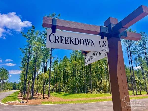 Discover the beauty of NatureWalk at Pond Creek, one of the most prestigious land communities in Northwest Florida. NatureWalk is nestled amidst pine tree forests, lush greenery, scattered oaks, and natural flowing creeks. The idealistic landscape is almost "untouched," providing privacy, peace, and serenity for each lot. Lot 9 is a beautiful and private 9.12-acre parcel located in a desirable cul-de-sac at the end of Creekdown Ln. There is approximately a 0.5-acre mulched homesite at the top of the lot, near the cul-de-sac. This homesite features a diverse array of vegetation, including mature pines, oaks, magnolia trees, and other trees that surround the creek area. The Pond Creek is located at the back of the property. ADDITIONAL COMMUNITY INFORMATION: NatureWalk at Pond Creek community was launched in 2023, and since then, this exclusive community has become a place that attracts buyers from all across the United States. The Owner's vision for this community is simple: Quality Family Living Centered Around Nature. Curved and paved roads, a distinctive community layout thoughtfully combined with Northwest Florida's natural beauty, high-end landscape features, common areas set in a scenic natural environment, and high-speed internet are all reasons for that. This unique community is situated on 653 acres of land, comprising 100 lots in total, and features homesites ranging from 2 to 15+ acres, including premium creek-front parcels. As of July 2025, close to 50 out of 100 parcels have been sold. LOCATION: Another aspect that makes this community very special is its location. NatureWalk at Pond Creek is conveniently located within a short drive of Publix, Big-Box stores, restaurants, and hospitals. Our community is centrally located for outdoor enthusiasts: from Blackwater River freshwater fishing and boating to our Gulf Coast, featuring the emerald blue waters of the Gulf of Mexico and beautiful beaches.