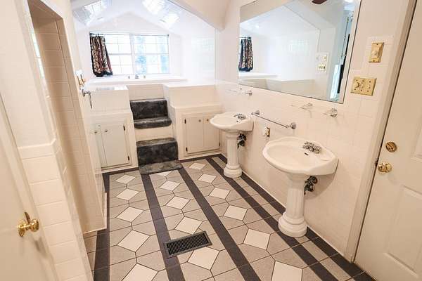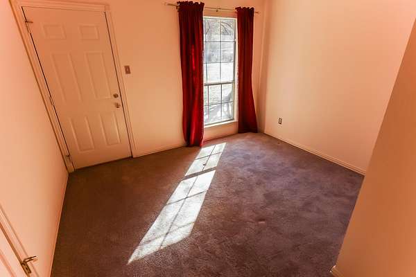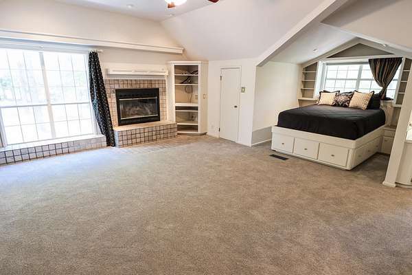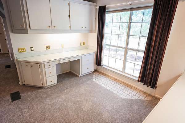 - Bookcases, Carpeting, Ceiling Fan, Paneling, Partial Curtains, Shades/Blinds, Tile Flooring