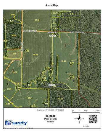 This beautiful 160+- acre property in southern Pope County presents a rare opportunity to acquire a highly productive, income-producing farm paired with exceptional recreational, hunting and long-term investment appeal. The farm consists of approximately 140 acres of tillable land currently in row crop production, generating $22,605 in annual farm rental income, providing immediate and reliable cash flow for the new owner. The balance of the property includes approximately 20 acres of wooded timber, offering excellent wildlife habitat and recreational opportunities. Even more unique, the tract directly adjoins the Shawnee National Forest, giving the owner direct access to thousands of acres of public land for hunting, hiking, and outdoor enjoyment, while also enhancing privacy and scenic value. Access is a strong feature of this farm, with road frontage on two sides, allowing for efficient farming operations, multiple access points, and flexibility for future improvements. The surrounding area is known for its strong agricultural base, great hunting and recreational opportunities in a desirable rural setting. From an agronomic standpoint, this property truly stands out. The soils are primarily Hosmer Silt Loam and Stoy Silt Loam-both Class II soils-with excellent Productivity Index (PI) ratings ranging from 93 to 107. These quality soils support consistent yields and make this tract a desirable asset for both farmers and investors alike. If your a deer hunter and land manager looking for a good quality deer and turkey hunting property, this property gives you a blank slate to create some great habitat for wildlife . Design and create some areas of native warm season grasses for bedding , plant trees, and design your food plots to make your own whitetail paradise while still leaving some crop field for income and food. Whether you are looking for a turnkey income-producing farm, a strategic land investment with strong fundamentals, or a recreational, hunting property with direct access to the Shawnee National Forest, this southern Pope County farm offers a compelling combination of income, productivity, access, and natural beauty.