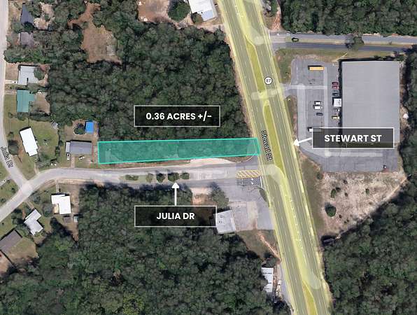 Prime commercial development opportunity in Milton, Florida. This offering includes TWO adjacent parcels totaling approximately 1.74 Acres, which must be sold together. The property is zoned HCD (Highway Commercial Development), allowing a wide range of commercial and mixed-use opportunities. The site features Power available and Public Water, and benefits from dual access via Julia Drive and Stewart Street (SR-87). Its proximity to a major roadway provides strong accessibility and visibility, making it suitable for a variety of uses, including retail, professional offices, service businesses, contractor operations, and other commercial development consistent with HCD zoning. The property is in an area Without an HOA and is Not in a designated flood zone, offering additional development potential. The surrounding area includes a mix of residential neighborhoods and established commercial properties, supporting potential business activity and future growth. Conveniently located just minutes from downtown Milton, Pace, and Interstate 10, providing easy access to Pensacola and surrounding Northwest Florida communities. Outdoor recreation and regional attractions are also nearby, including Riverwalk South, approximately 2.6 miles away, and Blackwater River State Park and Krul Lake, approximately 23 miles away. The property is also within driving distance of the Emerald Coast beaches, including Destin and Panama City Beach. With 1.74 acres of commercially zoned land, available utilities, and highway access, this property presents a strong opportunity for investors, developers, or business owners seeking land in a growing corridor of Santa Rosa County.
