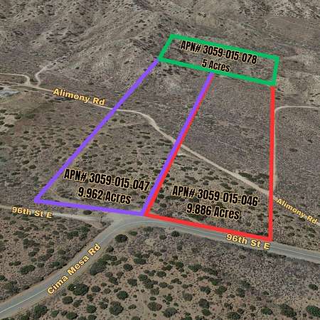 25 acres available in desirable Juniper Hills located in the southeast Antelope Valley. 360 degree views of the valley and the San Gabriel Mountains. Direct access to the National Forest via Alimony Truck Trail with great hiking and/or horse trails. The acreage includes three parcels-3059-015-046, 047 and 078. Located on paved road frontage. Must see to fully appreciate.
