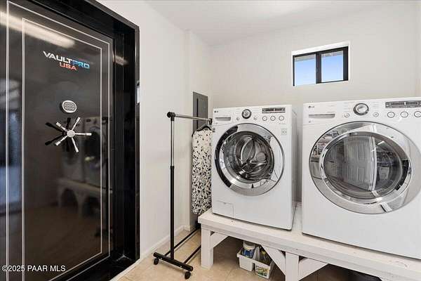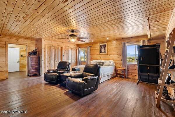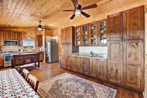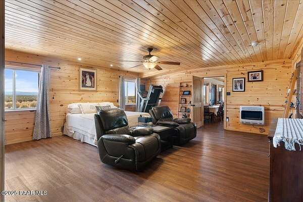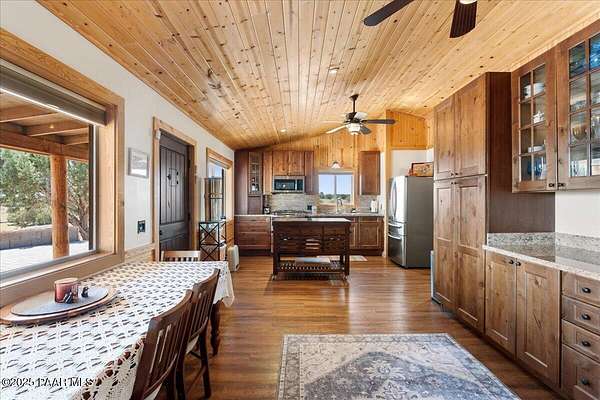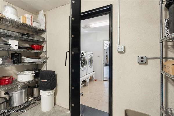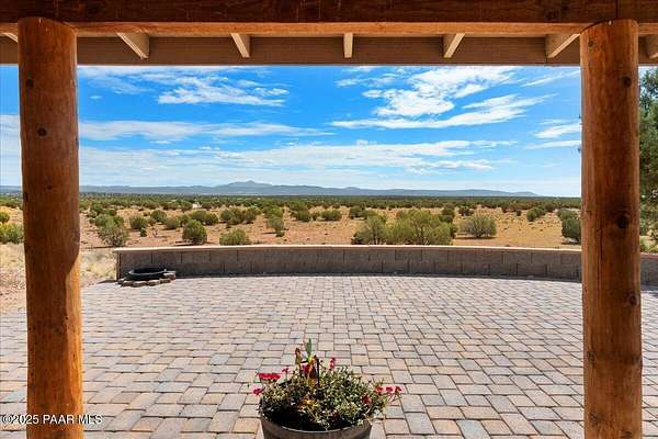 Nestled on over eleven partially fenced acres, this remarkable off-grid property blends comfort, security, and versatility. The spacious kitchen features new cabinets and gleaming granite countertops, complemented by abundant storage and panoramic views. A laundry room / craft room add to the home's practical charm, while a large panic room secured by two steel vault doors offers peace of mind. The massive primary bedroom boasts a 80'' flat screen TV and plenty of room for your California King and a sitting area. For guests and entertaining, there is a concrete slab ready for a travel trailer, anda bunk house with electricity. The 2-car garage provides attic access for extra storage. Self-sufficiency is assured with a 100% off-grid solar system (owned not leased) powered by lithiumbatteries, 18,000 gallons of water storage, and approximately 4,600 sq ft water catchment area with oversized gutters. High-speed Starlink Internet and a full dual video security system with sound ensure continued connectivity andsafety and a cement siding on the exterior of the home which is fireproof. The grounds include a large divided chicken coop, an electric gate, a 300-yard shooting range, and abundant wildlife for outdoor enjoyment. Panoramic views surround the property, andadditional acreage is available through a separate seller, making this a truly unique opportunity for those seeking privacy, comfort, and independence.