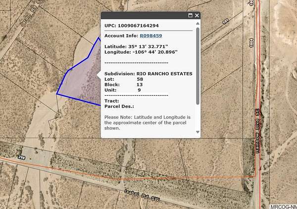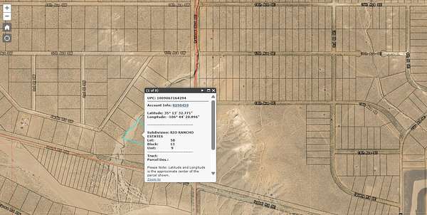Est $139/moGreat Views. Near( 1/2 Mile) Bernalillo County. Great Price! Buyer is responsible to confirm any restrictions, access and availability of ALL utilities including water.