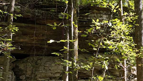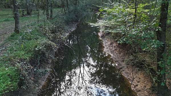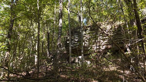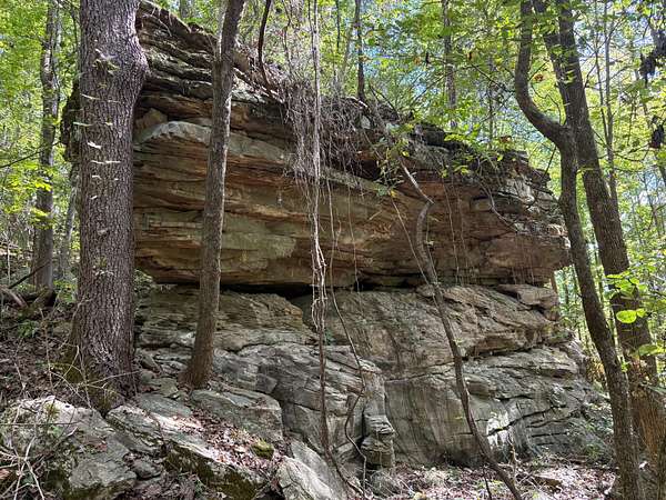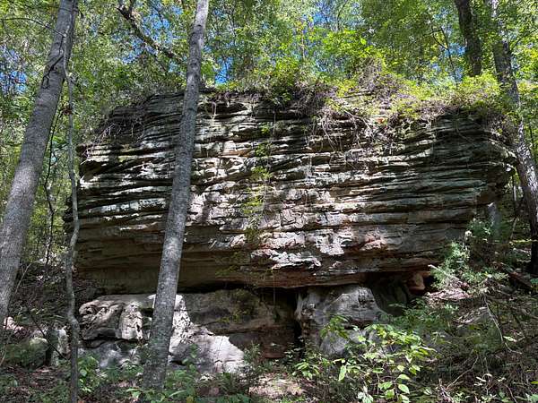 The acreage features mature hardwood timber, striking rock bluffs and formations, and a mix of terrain ranging from steep bluffs to rolling ground, fertile creek bottoms, and wetlands. Village Branch runs for more than half a mile through the property, providing year-round water and adding to the diversity of habitats.