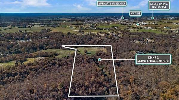 Discover 21 beautiful acres just outside the city limits of Siloam Springs, offering the perfect balance of privacy and convenience. Located just over a mile from Highway 412 with all paved road access to the property entrance, this land features a deeded easement from the main road. Utilities including gas, and electric are available at the road, onsite well and septic needed. Enjoy breathtaking sunsets, abundant wildlife, and a desirable mix of wooded areas and open pasture. Ideal for building your dream home or for future development as Siloam Springs continues to grow. Minutes from the Siloam Springs Kayak Park and the Illinois River, perfect for floating and smallmouth fishing. Only 10 minutes to historic downtown Siloam Springs, 25 minutes to I-49 and Springdale, and approximately 13 minutes to the new 612 Bypass upon completion. Country living with shopping and restaurants just minutes away!