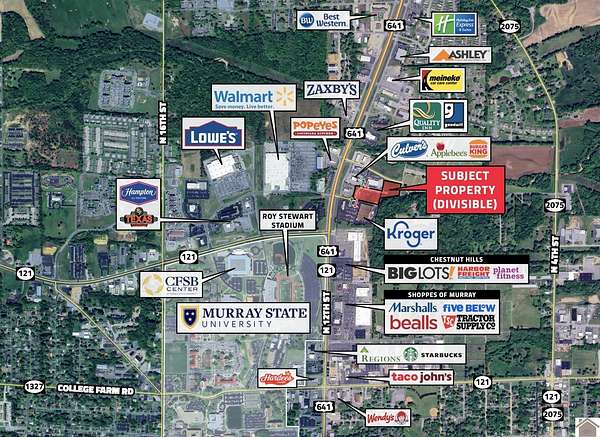 Est $3,746/moThis desirable 1.2+/- acre level lot is submersed in the middle of Murrays main retail and restaurant corridor with high daily traffic counts. It's just off of Hwy-641/N12th located adjacent to Kroger and Mega Gym and Murray State University within .5 miles. Neighboring businesses include a vast array of retail, restaurants and professional offices. Owners will subdivide the lot to fit buyers needs. Zoned commercial. Don't miss this opportunity for one of Murrays premier (and rare) pieces of land left in this heavily trafficked, high visibility area.