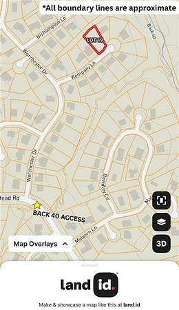 From I-49, go north to Bella Vista (becomes Hwy 71). Follow Hwy 71 to AR-340/E Lancashire Blvd exit. Take the exit and turn right on Lancashire Blvd. Turn left on Hampstead Rd. Turn right on Worcester Dr. Turn right on Kempsey Ln. Lot is at the cul-de-sac. GPS coordinates are 36.495056, -94.221153.
