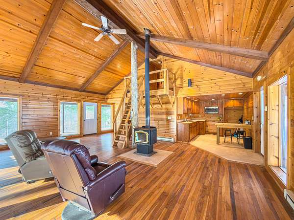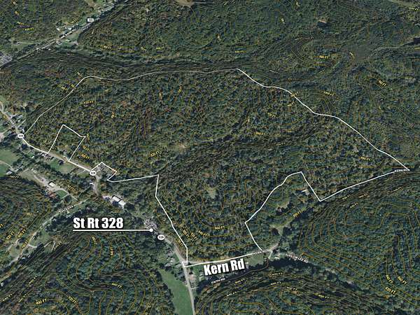 Situated in southeastern Hocking County, this 150-acre, mostly wooded property offers recreational and investment opportunities. Constructed in 1990, the 1,072 sq ft cabin is tucked deep into the property and features an open floor plan with a kitchen, full bath, and a bedroom on the main level. Upstairs, the loft features two small rooms, ideal for guests or additional storage. The cabin is equipped with a wood-burning stove and baseboard heat, along with a cistern water system and septic system. The large wraparound deck provides plenty of space for relaxing or entertaining, and the garage offers ample storage for vehicles, equipment, or recreational gear. A small pond is located just below the cabin. ATV trails provide access to the majority of the property. The topography is typical of the area, with multiple valleys and long ridgetops. For the hunter in the family, this property will not disappoint! There is a 1/4-acre clearing on one of the ridges that is ideal for a food plot. This land is conveniently located just 7 miles from Logan and approximately 5.5 miles south of US 33. There is road frontage and established driveway access from both State Route 328 and Kern Road. The property also borders a portion of the Wayne National Forest and offers ample unrestricted land for additional development. Mineral rights transfer. Annual property taxes are approximately $2,086.