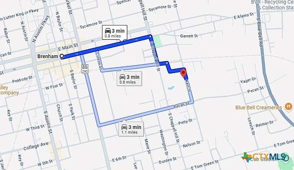 From Brenham, Texas head east on E Alamo St toward S Baylor St, and turn right onto S Chappell Hill St. Next, turn left onto Seelhorst St. Then, turn right onto Norris St. Finally, turn right onto Kerr St