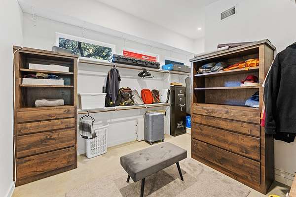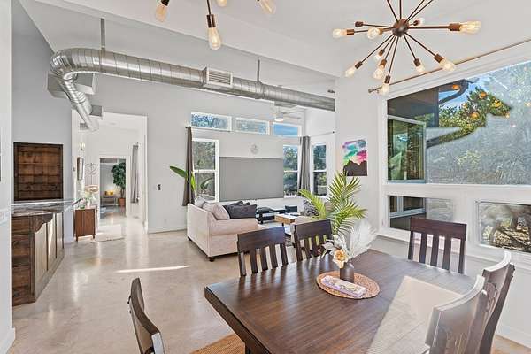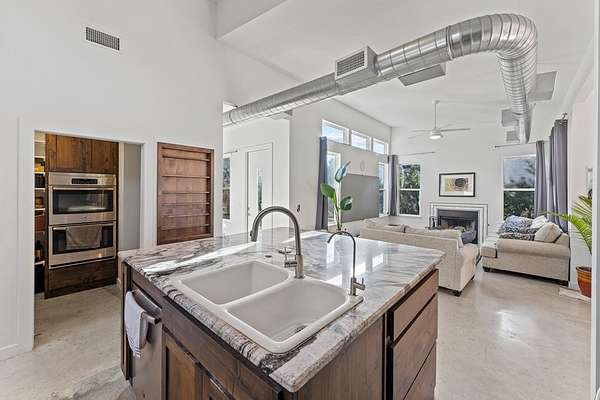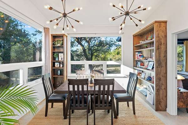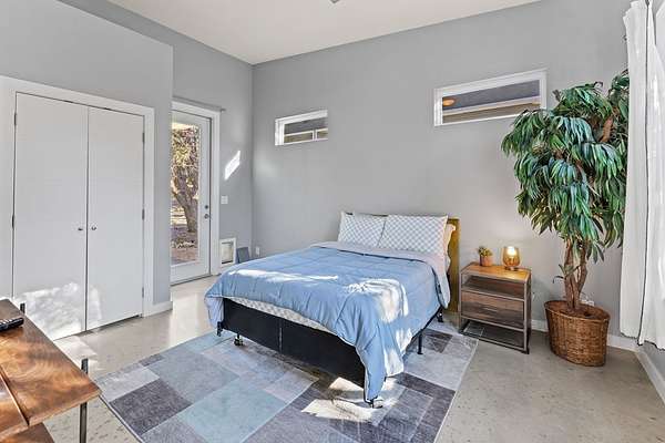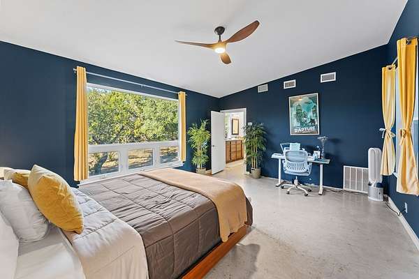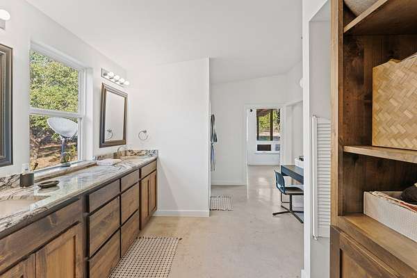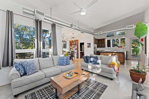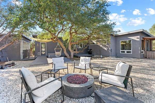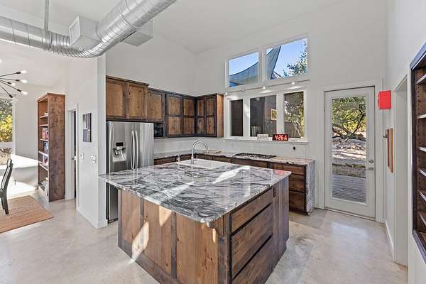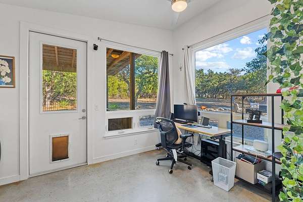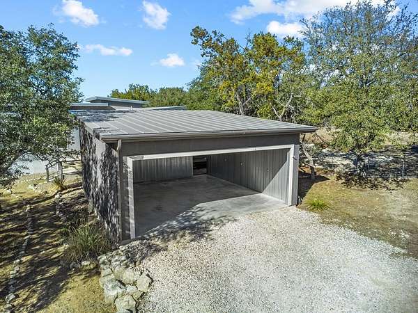 Tucked away on 2.5, wooded acres, this 2017 Hager Construction custom home blends modern design with Hill Country serenity. Offering 2 bedrooms and 2 baths, the layout is bright, airy, and intentionally designed to bring the outdoors in with expansive windows throughout. A versatile bonus space lined with windows creates the perfect setting for a home office, reading room, or additional bedroom. The home features stained concrete flooring for a sleek, low-maintenance finish. The kitchen is equipped for both everyday living and entertaining, complete with a gas cooktop, double ovens, and upgraded granite surfaces. Solid core interior doors enhance the overall quality and craftsmanship. Outdoors, you'll find inviting sitting areas, mature trees, and the kind of peaceful privacy that's hard to find, all just a short drive from Kerrville. Additional features include a standing seam metal roof, detached carport, and a storage building for added convenience.