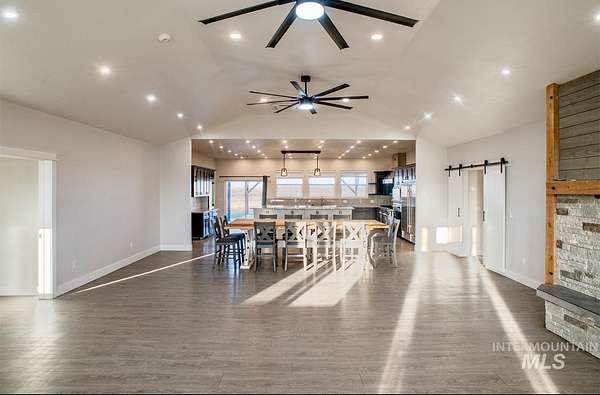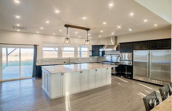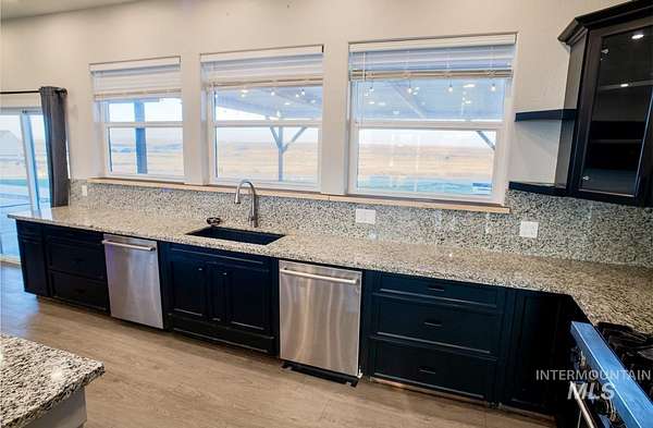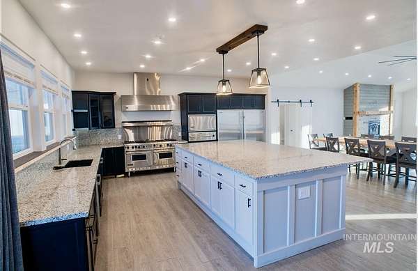 Perched on private roads with sweeping Snake River Canyon views, this spectacular 4,404 sq ft custom estate offers exceptional privacy, functionality, and a prime location just minutes from Twin Falls, Blue Lakes, Shoshone Falls, and the river launch. Thoughtfully designed for luxury living and entertaining, the home features six bedrooms, four bathrooms, two offices, a home gym, and a gas fireplace. Comfort and efficiency are enhanced by a whole-house mini-split HVAC system and dual Navien on-demand water heaters, while a laundry room with an adjacent shower adds everyday convenience. The chef's kitchen is a true centerpiece, showcasing Sub-Zero refrigeration, a 60" Viking range and hood, a 72-bottle wine refrigerator, a 125-lb ice maker, and an expansive 9*13 walk-in pantry. The kitchen opens seamlessly to an extraordinary covered patio with a full outdoor kitchen, creating an ideal setting for entertaining against a dramatic canyon backdrop. The garage and shop space rival the home itself. The 1,378 sq ft four-car garage offers 16' ceilings, two 17*12 doors, a gym, an office, and a 600 sq ft loft. Completing the property is a 40*50 insulated shop with two 14*12 doors, storage rooms, and an 800+ sq ft loft. A rare combination of luxury, versatility, and unforgettable views.