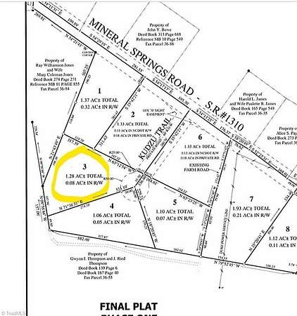 Est $223/mo1.28 acres Caswell County, North Carolina building lot on cul-de-sac. Excellent topo - slab or crawlspace foundations supported. Septic supported. Additional lots available. Mobile/Modulars OK. Additional info on listing agent's website.