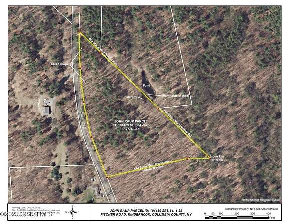 WHAT A FIND - OK GO! Build your Hudson Valley dream home in Kinderhook on this private 8 acre wooded parcel with a pond view (some deer too!). Location just off 9H; less than 10 minutes from the Historic Village area of Kinderhook (historic properties, restaurants, theatres, art galleries, orchards, farms, etc.), 10 minutes to Columbia County Airport, 20 minutes to Hudson/Amtrak to NYC, 30 minutes to Albany/Airport; Ichabod Crane School District. Many large mature oak, pockets of pine, also hemlock trees (some oak may hold value for selling/lumbering). USDA mortgage eligible location, zoned 02 for single family, most of pond is off property. Please do not trespass, scheduled appts only. Walk the property showing where you are in real time using a free app/parcel file provided. Flagging/Maps are approximate. SE corner monument that is a stone pile with Rebar was flagged along with a stake . A stake w/flagging was placed at the approximate SW and NW corners. Old low stone wall remnants were found along the south and east property boundaries. The west boundary shares the ROW with Fischer Road. LA has flagged along Fischer Rd to show approx. west side boundaries. See documents for details. Best place to park is beyond 505 Fischer Rd on right off Rd. Easiest to walk in near the FOR SALE sign. PROPERTY ON LEFT between 562 and 505 Fischer Rd Homes. Electric at road. Property has been in family for years. No perc or well tests have been done. Homes in the area have well and septic systems. Highest point of property is at the tip of the triangle. The mid-lower end of the triangle affords many opportunities for home placement and driveway options. DON'T MISS WEBSITE!