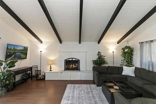 Upon entry, the home opens to a grand vaulted great room with bright white ceilings accented by striking exposed beams, a statement fireplace, and expansive sliding glass doors providing access to multiple patios. The layout offers thoughtful bedroom separation with one bedroom to the left and three bedrooms to the right.