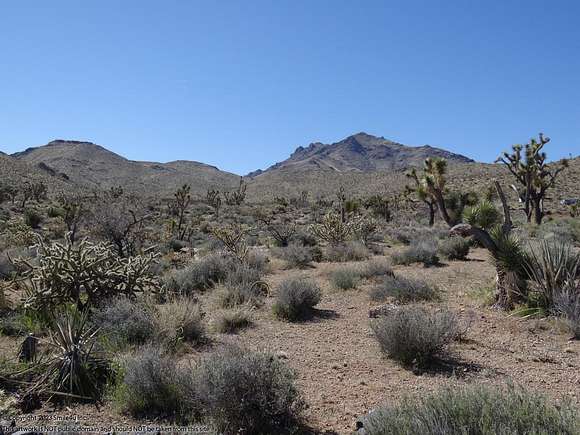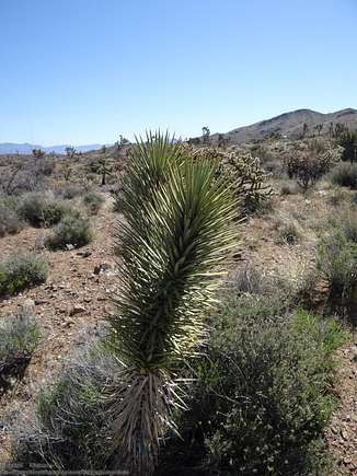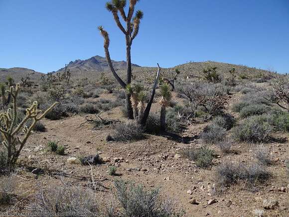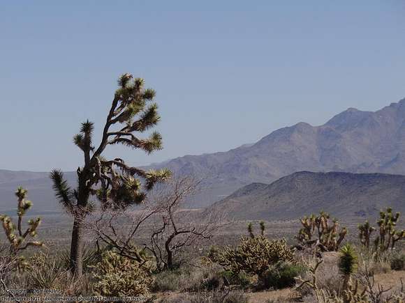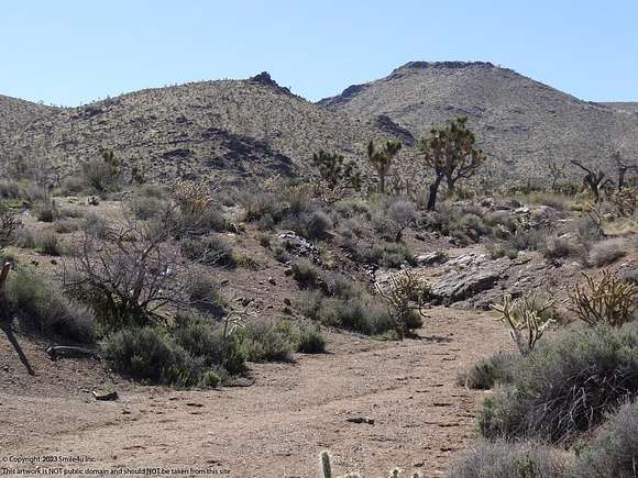 Oh she is a peaceful chunk of land hidden in the Joshua Trees and plenty of views across the valleys to the gorgeous interesting mountains! The property is mostly flat with a gentle roll down to the east for a ways off the road til about half way thru and then there is a bit of an intermittent stream that is coming down off those hills to the south. It then slopes up the hill a bit to the east and flattens out on the east half of the property.