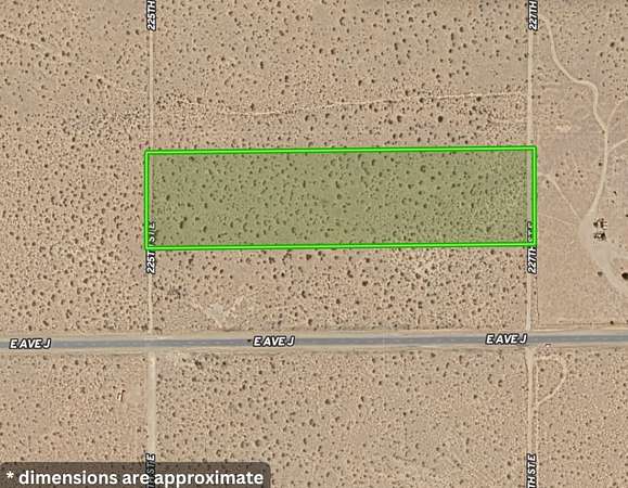The property features dual access from both 225th Street E and 227th Street E, county-maintained dirt roads sitting approximately 300 feet from paved E Avenue J. This proximity to pavement significantly improves accessibility in varying weather conditions and simplifies travel, utility arrangements, and long-term planning. The long rectangular parcel spans approximately 1,340 feet along northern and southern boundaries with consistent flat desert terrain requiring minimal grading for development.