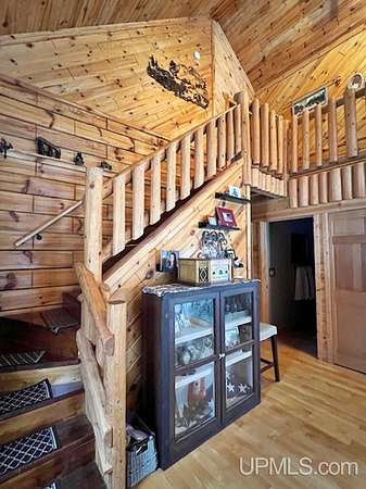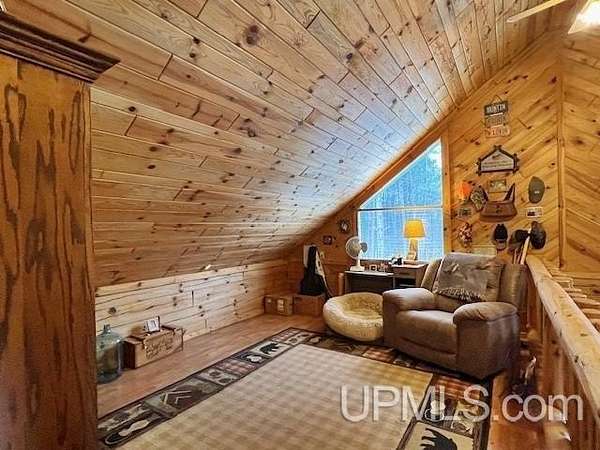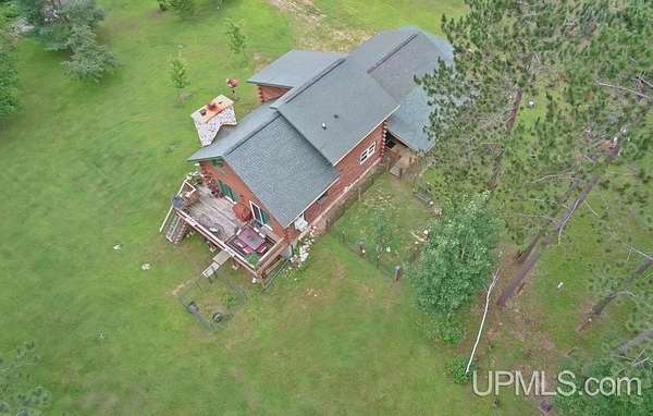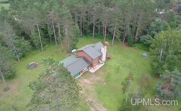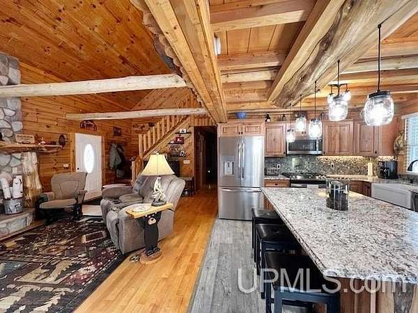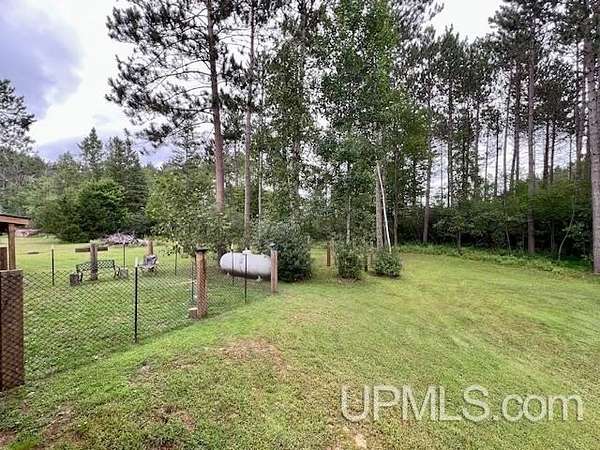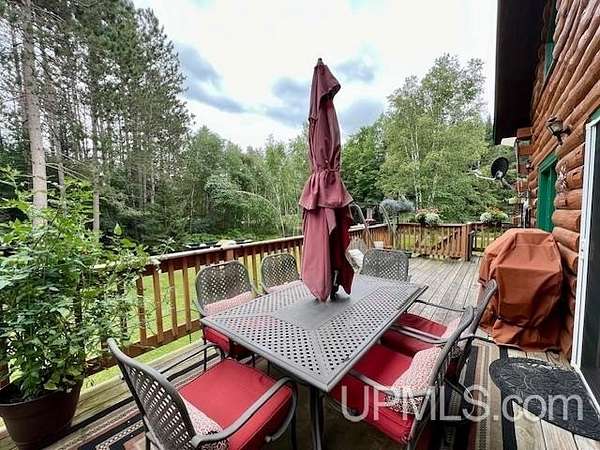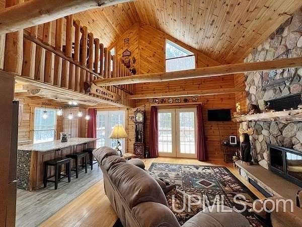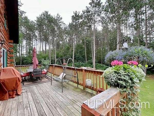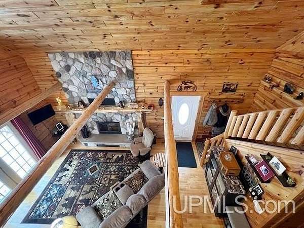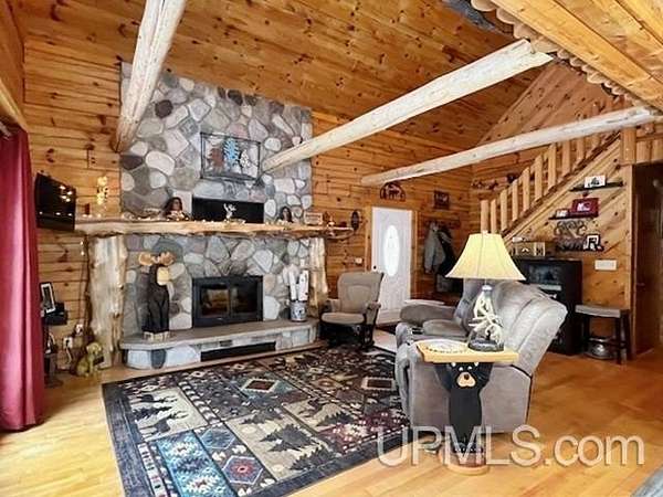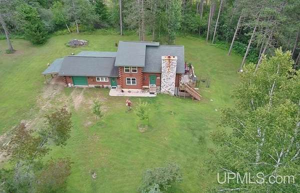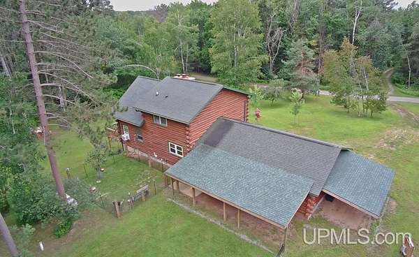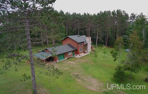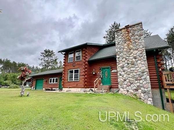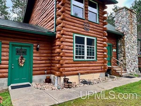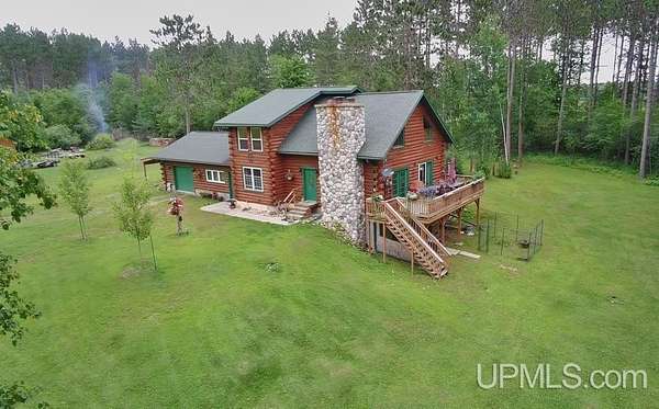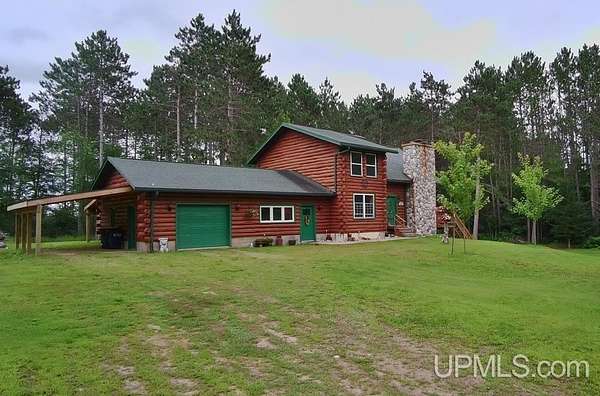 Updated 3BR, 2 BA log home offers the peacefulness of nature you've been looking for--whether as a primary residence or vacation retreat. The open-concept main level features gorgeous woodgrain throughout and an upgraded kitchen with new hickory cabinets, granite countertops, and updated lighting. The living room is highlighted by a soaring ceiling with cross beams and a beautiful fieldstone wood-burning fireplace. You'll also find a cozy family room and convenient first-floor laundry. The second level includes a charming reading nook overlooking the great room below, along with a spacious primary bedroom suite complete with jetted tub and walk-in shower. The full walk-out basement offers additional storage space and a workshop area. Heating is provided by GFA along with a new energy-efficient wood furnace to help keep utility costs low. Enjoy the outdoors from the expansive deck overlooking the wooded 1.5 acres. Property features a fenced-in kennel and garden area, an attached 1-car garage, and two lean-tos for extra covered parking. Located on a quiet dead-end town road with year-round access, direct ATV trail access, and only 1 mile from the Nicolet National Forest, this log home is perfectly positioned for adventure in this Northwoods paradise.