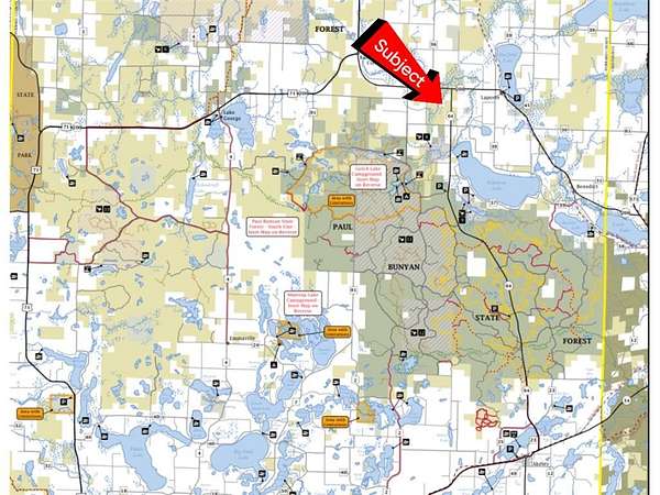 From Park Rapids 34/71 Interesection, Head East 18.5 miles to Highway 64 and turn L, continue 15 miles and sign will be on Left (West) side. There is an easement roadway into the property and continue to gate. You will be able to walk trails from there.