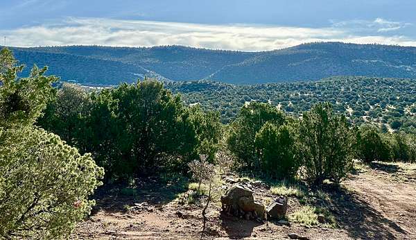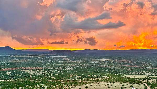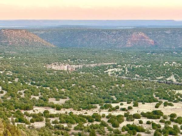 The ranch is defined by a dramatic series of rocky bluffs, including roughly a mile of rimrock rising more than 300 feet above the surrounding landscape. Rolling hills, mesas, pinon-juniper woodland, arroyos, and prominent rock outcroppings create a diverse setting across elevations ranging from approximately 5,800 to 6,300 feet. Higher ground provides broad vistas and a selection of potential building sites positioned for views and separation.