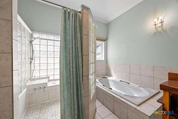 - Cathedral Ceilings, Cedar Closets, Ceiling Fans, Entrance Foyer, Garden Tub Roman Tub, High Ceilings, Kitchen Island, Main Level Primary, Multiple Living Areas, Primary Downstairs, Recessed Lighting, Separate Shower, Skylights, Walk In Closets, Window Treatments