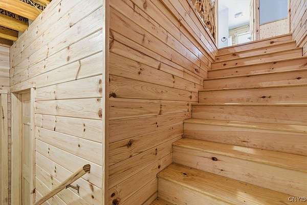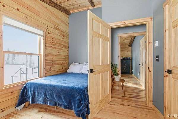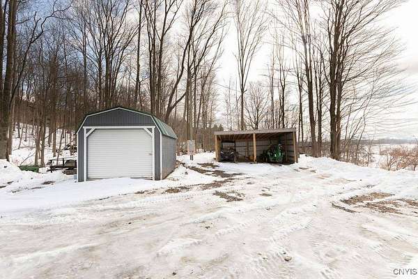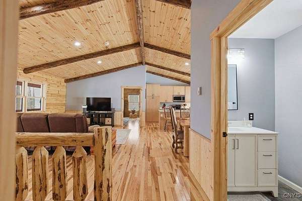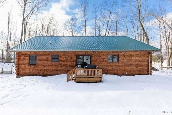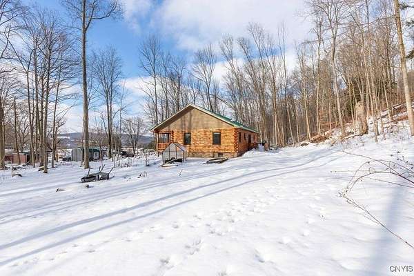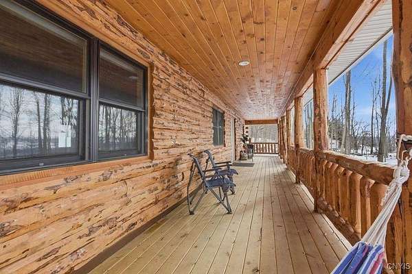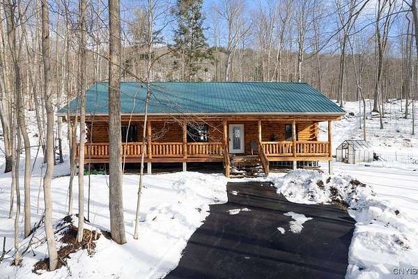 Rare offering on NY-12B -- a charming log cabin retreat nestled on just over 9 acres just minutes from Colgate University, premier local dining, shopping, and outdoor recreation. This lovingly crafted cabin blends rustic character with modern comfort, gleaming hickory hardwoods throughout, featuring exposed timber beams, natural wood finishes, and serene views of expansive wooded acreage. Spacious and versatile living areas, large owners ensuite plus 2 additional bedrooms, & full bathroom, open concept with high ceilings, finished room in basement could be office,and exterior walkout ICF basement is ready for finishing, great outdoor spaces perfect for relaxing by a fire in the evenings or entertaining guests. Whether you're enjoying morning coffee on the deck surrounded by nature or cozying up inside after a day exploring Central New York, this property embodies peaceful country living with convenient access to Hamilton and the Colgate campus. Room to roam, hiking trails, gardening, or future expansion -- a truly unique opportunity for year-round living, weekend getaway, or investment property. Don't miss your chance to own this one-of-a-kind log cabin sanctuary in the heart of Madison County.