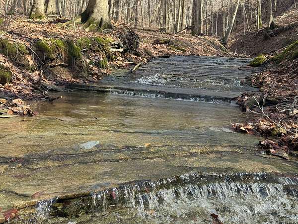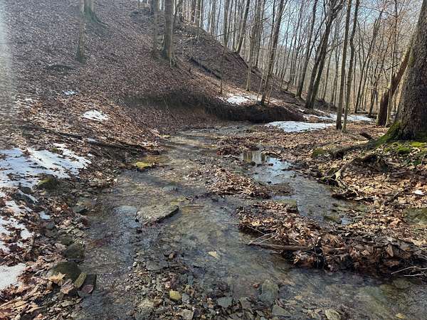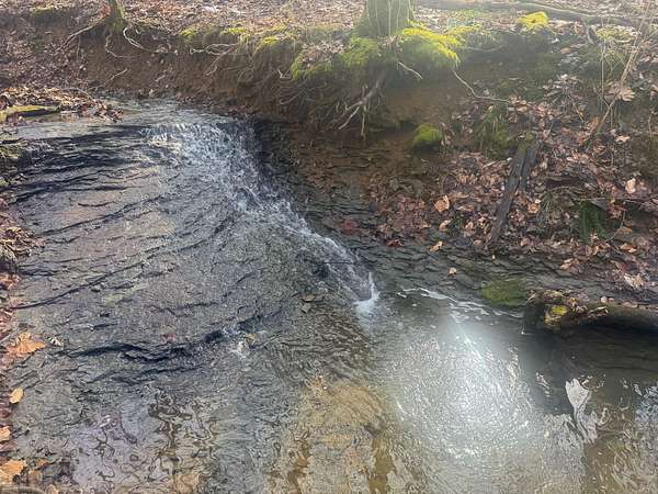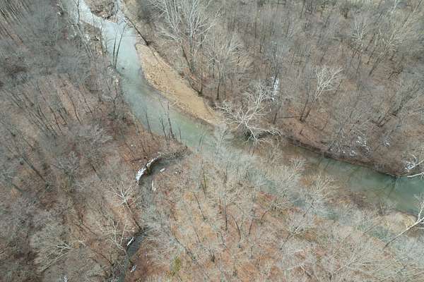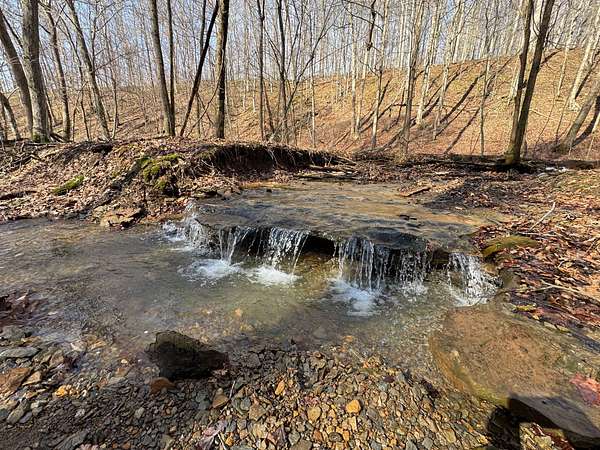 A scenic limestone- and shale-lined creek winds through the center of the property, showcasing exposed stone, geodes, and natural character. This smaller creek feeds directly into Back Creek, providing opportunities for fishing and kayaking, with reported populations of largemouth bass, crappie, and sunfish.