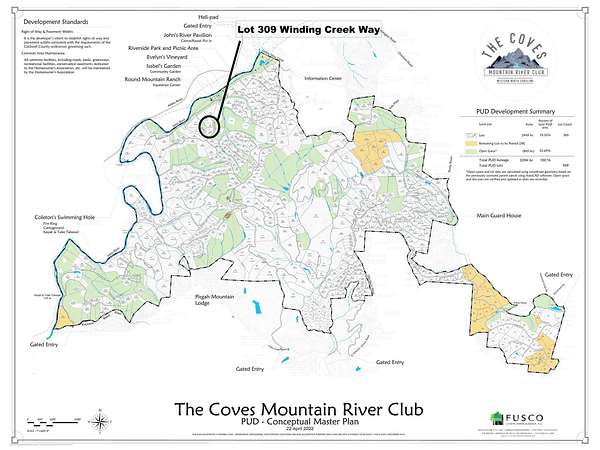 Enter The Coves' gates on the corner of Johns Ridge Pkwy and Valley View Circle. Continue on Johns Ridge Pkwy for approx 1.7 mile; turn right onto Winding Creek Way. Lot 309 will be the last vacant lot on the left as you approach the culdesac end.