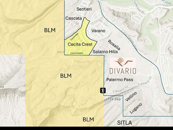Est $2,255/moIt's all about views. Building lot in Cecita Crest at Divario. Panoramic views in vibrant, new community. Easy access to BLM ground and hiking/biking trails. The 730 acre master planned community is adjacent to 18-hole Sunbrook Golf Course. Divario is surrounded in a picturesque setting with red rock vistas and views of Pine Valley Mountain. Open space in Divario includes natural groomed hiking/biking trails with connections to BLM ground and city planned Divario community and neighborhood parks. Lot 115 bordered on rear lot line by BLM ground.