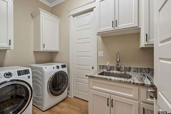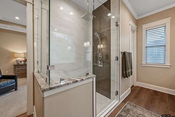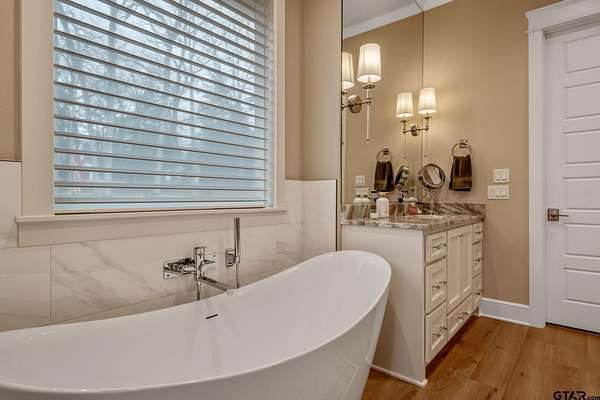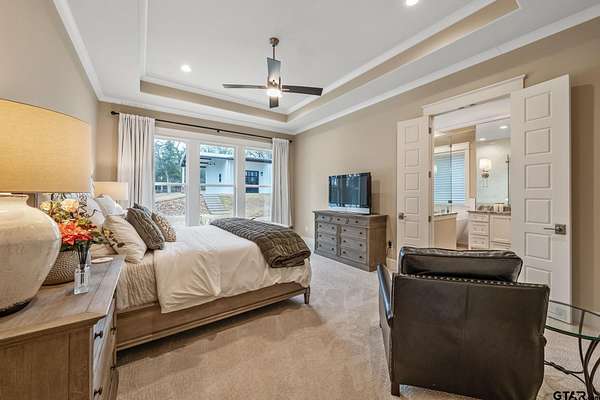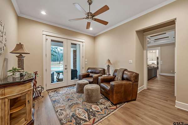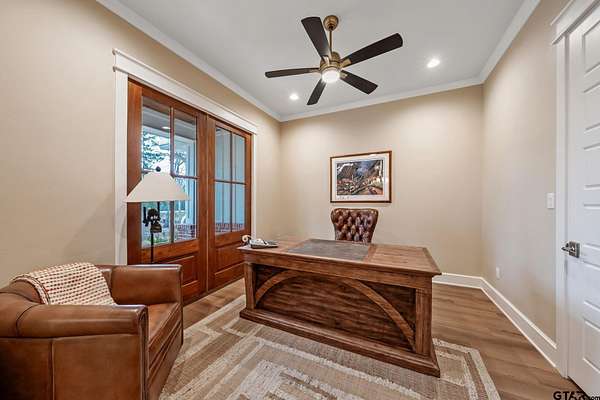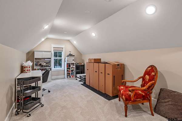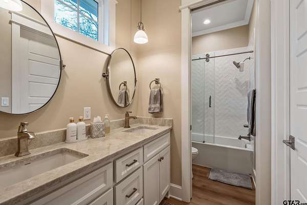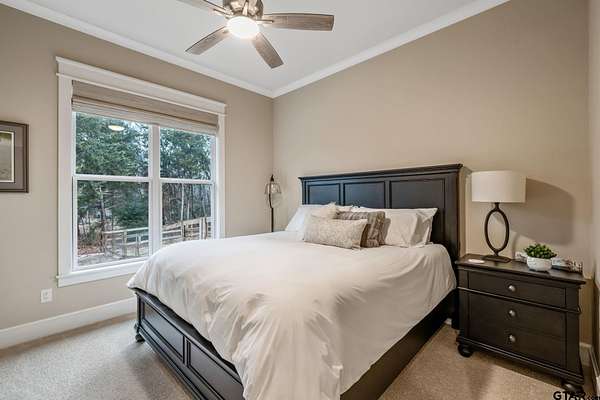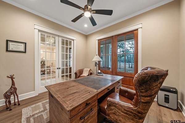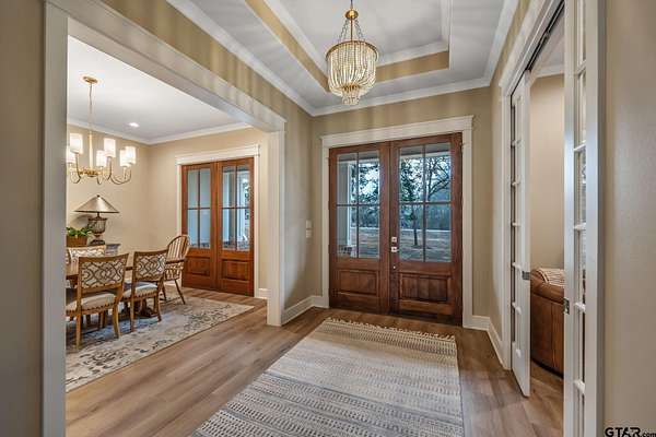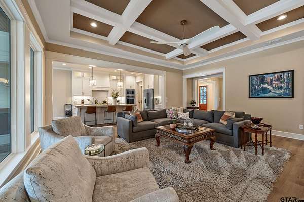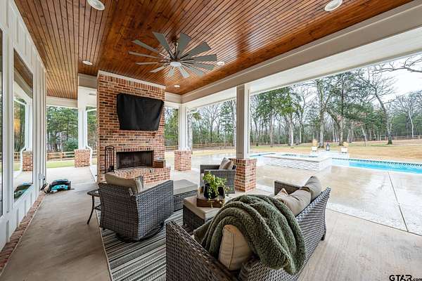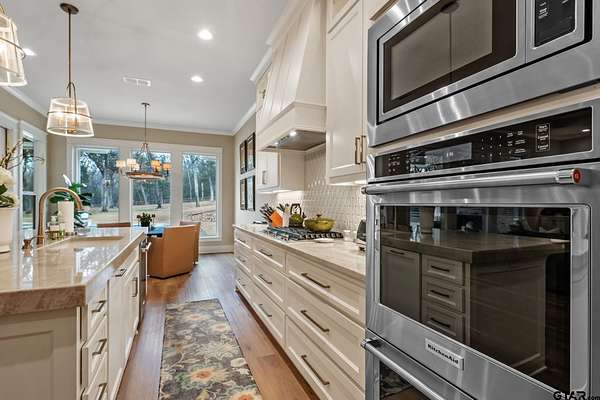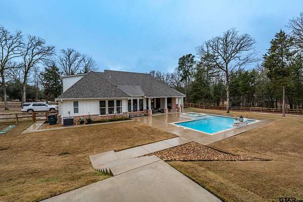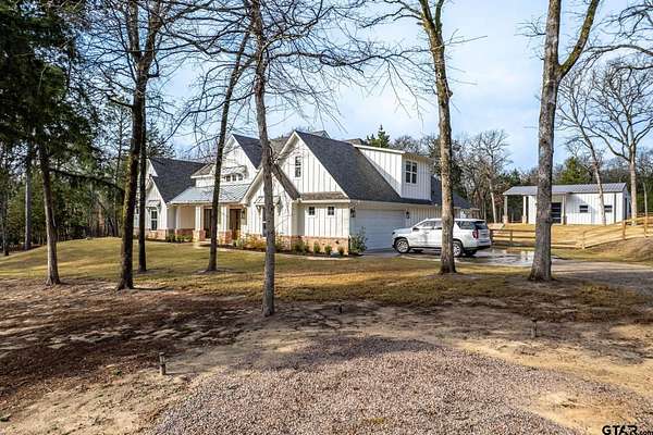Tucked into the trees of Caney Creek Springs, this exceptional modern farmhouse offers refined design, privacy, and resort-style amenities on 2.4 acres in award-winning Lindale ISD. Completed in 2023, this custom build blends luxury finishes with thoughtful functionality throughout. The open-concept interior features a spacious family room with stacked-stone fireplace, coffered ceiling, custom built-ins, and expansive windows overlooking the backyard. The chef's kitchen is the heart of the home, showcasing an extra-thick quartzite island, floor-to-ceiling cabinetry, gas cooktop, double ovens, premium stainless appliances, and a walk-in pantry with abundant storage and workspace. The private primary suite is set apart and offers a peaceful retreat with tray ceiling and spa-inspired bath featuring dual vanities, freestanding soaking tub, luxury walk-in shower with floating bench, and extensive custom storage. The primary closet connects directly to the oversized utility room for added convenience. Additional bedrooms are well-appointed, while an upstairs bonus room, or 5th bedroom, with full bath provides flexible living space and access to generous attic storage. Outdoor living shines with a covered back porch featuring tongue-and-groove ceiling and an outdoor fireplace, all overlooking a heated pool and fully fenced backyard. The 30x30 insulated shop includes a 10-foot overhang, is plumbed for water, wired for 220, and offers outstanding versatility for hobbies,, entertaining, or workspace. Additional highlights include solid-core doors, foam insulation, tankless water heater, aerobic septic system, multi-zone HVAC with smart controls, and an oversized side-entry garage with storage. A rare opportunity for luxury, privacy, and East Texas living at its finest.