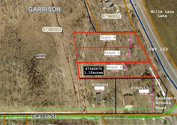 Estimated TAX amount TBD for TRACT B (PID 67360670): This is a 2025/2026 LOT SPLIT FROM 67360502(GOV. LOT 3 SEC. 36, EXCEPT THAT PART DESCRIBED AS FOLLOWS; COMM. AT THE POINT WHERE THE N. LINE OF GOV. LOT 3 INTERSECTS THE W'LY ROW LINE OF STATE TRK HWY #169, THEN SE'LY ALONG THE W'LY ROW OF SAID TRK HWY 169 FOR A DIST. OF 700 FT, THEN W. & PARAL LEL TO THE N. LINE OF GOV. LOT 3 FOR A DIST. OF 150 FT, THEN NW'LY AND PARALLEL TO THE W'LY ROW LINE OF SAID STATE TRK HWY 169 FOR A DIST OF 700 FT TO THE N. LINE OF GOV. LOT 3, THEN E. ALONG SAID N. LINE OF GOV. LOT 3 TO THE POINT OF BEG, EXCEPT TH A T PART TO WILLIAM LYBECK, AND EXCEPT PART TO BYRON KILLMER, & EXCEPT PARTS TO A. AESHLIMAN & EXCEPT PARTS TO KINYON AS CONVEYED AND RECORDED IN THE OFFICE OF THE COUNTY RECORDER, AND EXCEPT PART TO ALOIS LITFIN, & EXCEPT PART ARVIN)