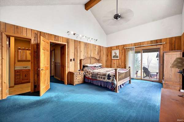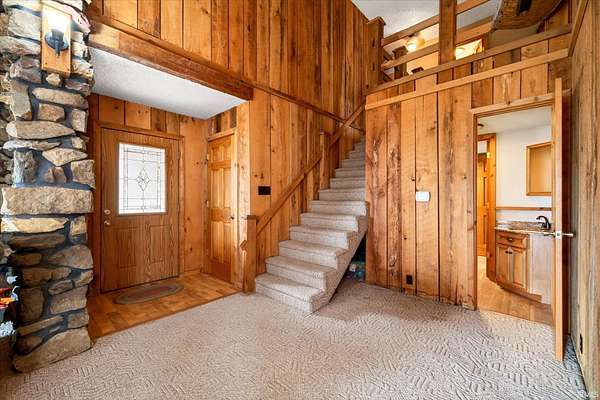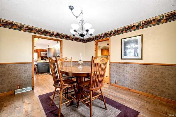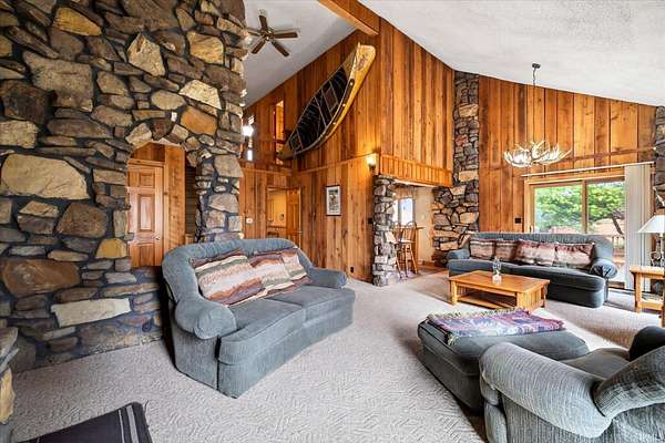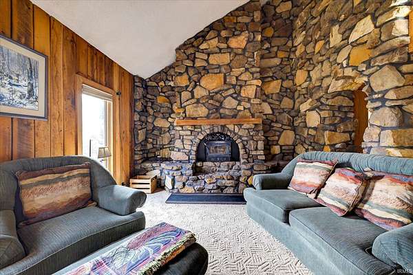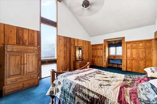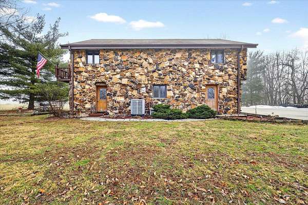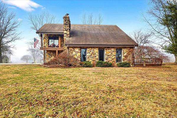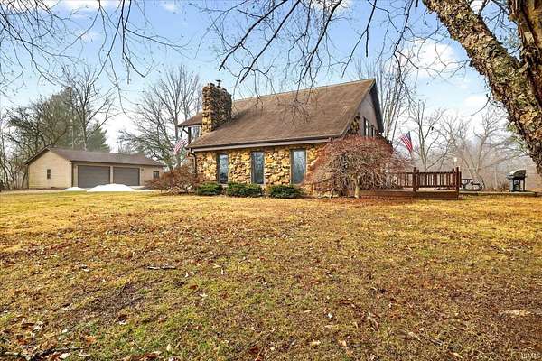 Located on the western edge of Linton, this unique property offers space, character, and versatility. Built in 1976, the home is thoughtfully positioned at the center of a 1.55-acre lot, surrounded with trees and mature landscaping, capturing scenic views from the upper-level balconies. This two-story, lodge-inspired home features 4 bedrooms, 2.5 baths, and over 2,200 square feet of finished living space. The exterior showcases an attractive blend of natural native fieldstone and wood accents, setting the tone for the rustic character found throughout. Upon entering the front foyer, you're welcomed by a dramatic two-story vaulted ceiling over the expansive living room, filled with natural light. A floor-to-ceiling fieldstone fireplace with a wood-burning insert provides both visual appeal and supplemental heating. Patio doors lead to an open deck, ideal for entertaining or enjoying the peaceful setting. The living room opens to a galley-style kitchen with a sitting bar, while a formal dining room is located just off the opposite side of the kitchen, perfect for family gatherings and hosting. The main level also includes a half bath, a designated utility room with additional storage space, and a laundry room with washer and dryer, conveniently located off the large attached two-car garage. Upstairs, you'll find all four bedrooms, each offering exterior access to balcony views. The owner's suite features another vaulted ceiling, two spacious closets, an electric fireplace, and a private three-piece bathroom. Utilize additional storage with both the house and the garage attic access. A separate 1,200-square-foot heated, detached two-car garage and workshop was added in 2000, providing ample space for hobbies, storage, or projects. Enjoy the convenience of city proximity and Linton utilities while embracing the feel of cabin-style living. Property is being sold as-is.