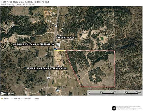 Use address 34488 N US Highway 281, Lipan, TX 76462 to Brian's place. Take PR 766 that runs in-between Brian's place and the storage building. Take PR 766 till you get to a gate that has SDR on the gate. A access easement from Hwy 281 will convey with sale. No sign on the property currently.