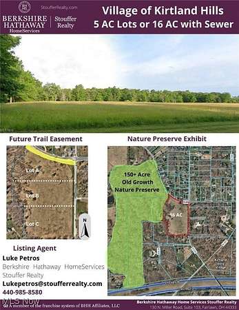 A gorgeous home site in the prestigious Village of Kirtland Hills community. Build your dream home on this breathtaking meadow surrounded by mature trees with a rare 150-acre old-growth nature preserve in your backyard! Situated on the desirable Little Mountain Road, this 5.2-acre parcel has been recently split from the original 16-acre parcel, which can also be sold in its entirety. Enjoy a quiet and serene lot with a rural feel, all within a 5-10 minute drive of the world-class Cleveland Clinic & all the retail amenities you could ask for. Build in peace, knowing your backyard is a permanent Nature preserve and one of the rare few, undisturbed Old old-growth forests with some trees having a base circumference over 17 ft.