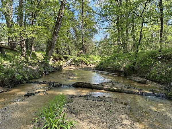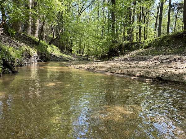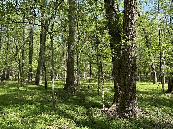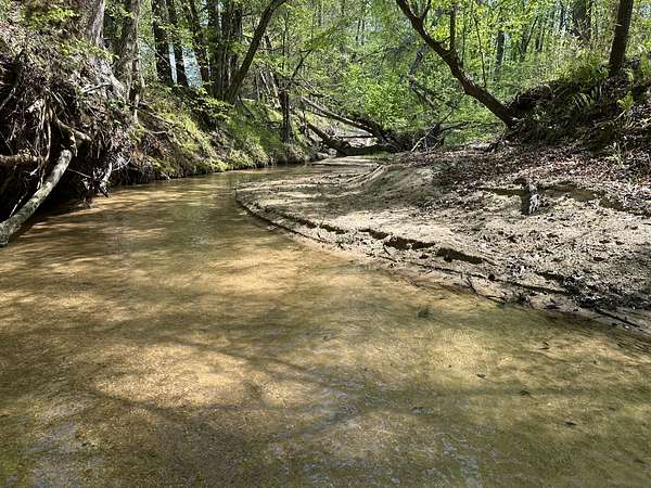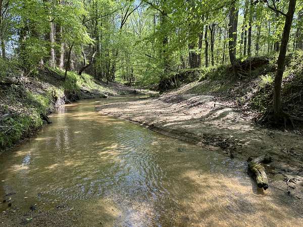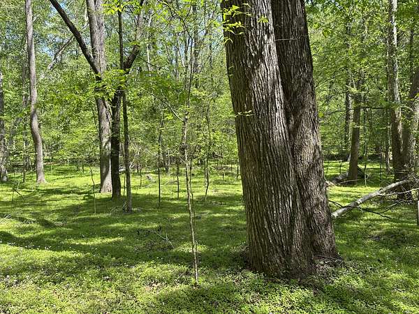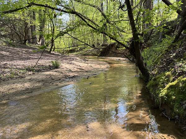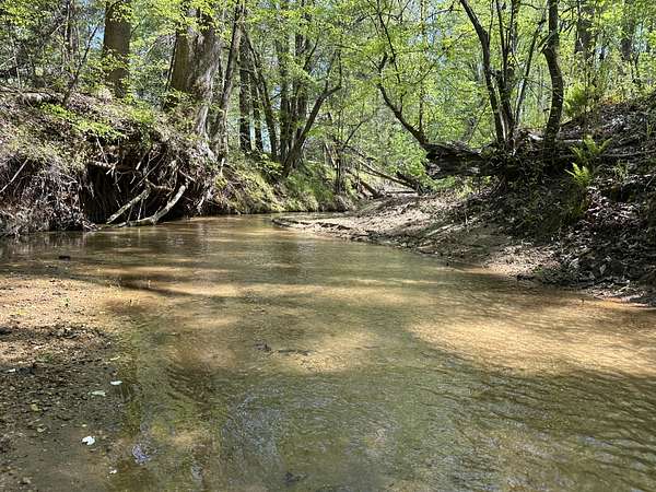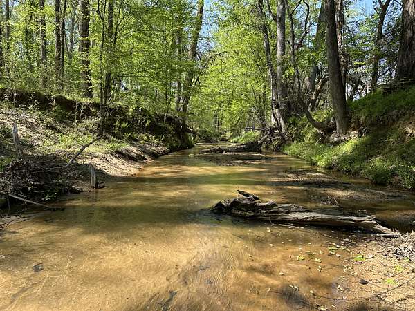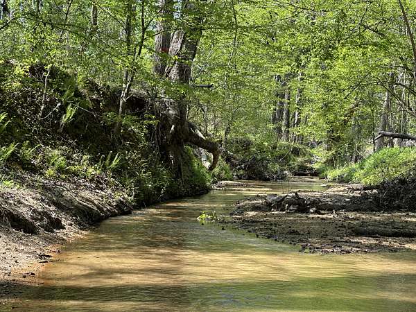 About 25 acres are covered by mixed, mature hardwood forest. This includes the steepest parts of the land with very strong slopes and some gullied areas. These slopes are dominated by oaks, hickory and American beech. Rodens Creek is a large stream with a sandy, gravely bottom that runs the northeast property line for about a quarter mile. The hardwood bottomland along the creek is wide in places. Another broad bottomland is found extending toward the middle of the tract just north of the powerline right-of-way. Yellow poplar, sweetgum, and river birch shade these level bottomlands. Trees are widely spaced, and much of the ground is covered by grasses.