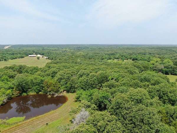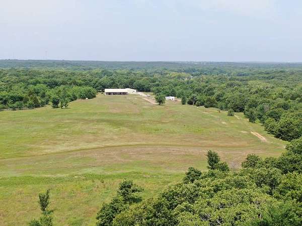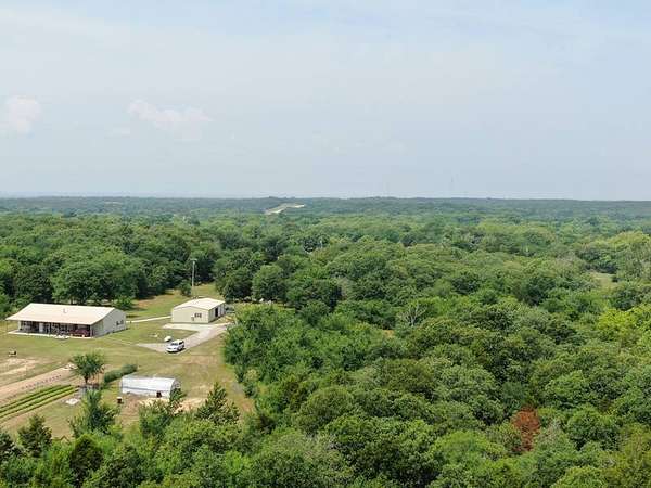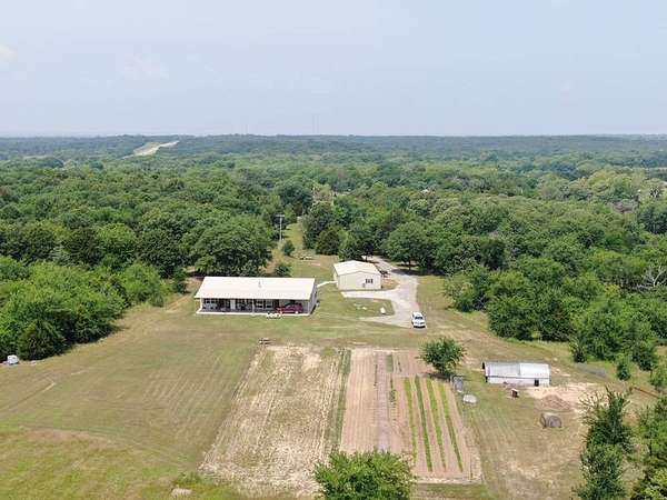 This beautiful and versatile 80-acre ranch is sited approximately 2.75 hours north of Dallas, TX and 1.75 hours south of Oklahoma City, Oklahoma. It features a 2100 square foot metal sided two-bedroom two-bath home with an open concept floor plan. The kitchen was well designed with ample preparation space and solid wood cabinets with exotic granite countertops. Additional kitchen amenities include pullouts, a gorgeous Black Walnut topped island with prep sink, storage for a cookbook collection, knife drawer, stand mixer storage, Jenn-Aire propane cooktop, and soft-close cabinet doors and drawers. A 10' X 10'pantry has some adjustable shelving, drawer storage and electrical outlet; plus, an additional pantry that is currently used for canning supplies. The home features lots of natural light from the many windows. Central heating and air system provides a comfortable environment in the home. The wood heater can heat the home also and acts as a backup for those that enjoy wood heat. The primary bedroom suite boasts plenty of room for a king bedroom set, chest, dresser and additional space, and a HUGE walk-in closet. The primary bath features two sinks with good built-in storage under the sinks with a cabinet tower separating the two. The nice size, handicap accessible, tiled shower features storage cubbies and dual shower heads. The hall bath features tiled flooring, shower/tub combination and a closet. The home also features three-foot doors throughout, except for one closet door. The interior walls are a combination of sheet rock and tongue and groove pine. The 14' X 70" covered patio across the full back of the home provides many outdoor living options from sitting and watching the wildlife, overlooking the pasture and garden, outdoor grilling, etc. The shop is fully insulated with a guest quarter that includes a bedroom, closet and large three-quarter bath with additional storage space. Three overhead doors (9'X7'9") and two walk-in doors give good access to the shop. There is also overhead storage, 3'X30' and 8'X10'. Additional amenities include an RV Hookup, and a 12'X12' green house with equipment shed built on, and an additional storage shed. The garden is approximately 1/4 acre presently, with deer resistant fencing. Two Asparagus beds are already producing. The land consists of open pasture and forests made up primarily of hardwoods. Water for livestock and wildlife is in the form of a pond and a seasonal stream. The seasonal stream has a waterfall during the rainy season that is approximately six feet tall. The entire perimeter of the property is fenced and the fencing is in good condition. This property is both functional and aesthetically pleasing. The trail system through the property provides access around and through the land as well as a scenic experience of wildlife, forage, wildflowers and beautiful Oaks and hardwoods.
