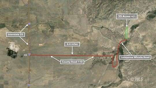 From Walsenburg, take I-25 N, exit 64 towards Lascar, Right on County Road 110, Right on Lonesome Whistle Rd, continue to very end of road, property is at the dead end (see sign).