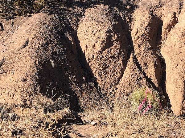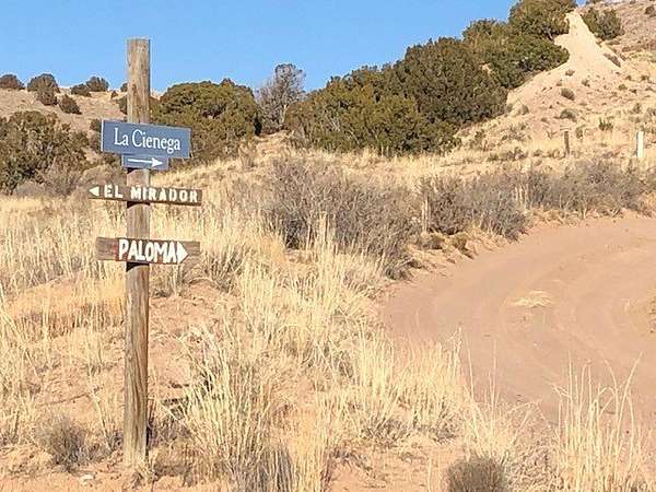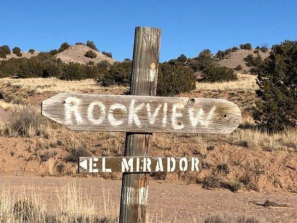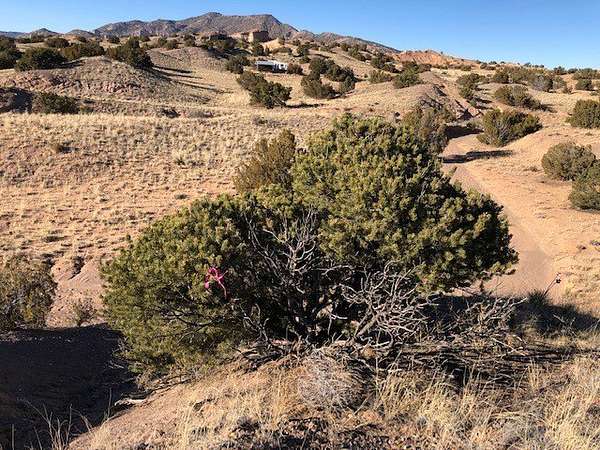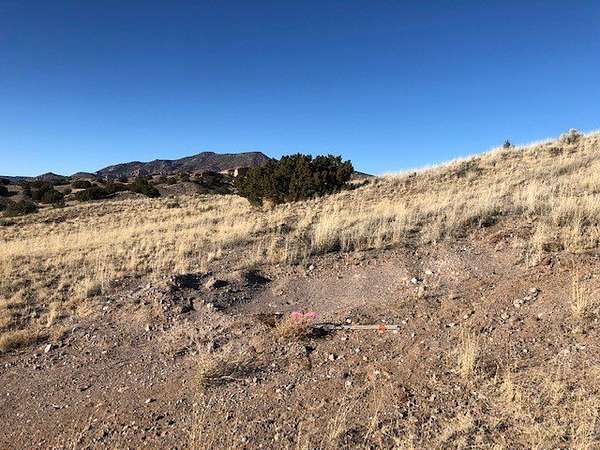 Take US 285/84 north out of Espanola; stay straight on US 84 where US 285 turns northeast. Turn right on NM 554. Drive 6/10 mile and turn right on NM 142. Drive 1.4 miles and turn left on Poloma Drive. Set your odometer here. Go past Duane drive and veer left at El Mirador. Veer left again at the cluster of signs for Rockview & El Mirador. At 0.5 miles from the intersection of NM 142 and Poloma, turn right on an unmarked dirt road which crosses the arroyo, just before a small square shed with a wooden fence and a white outhouse. Drive 2/10 mile to the southwest corner of the lot. You will see a rebar at the corner with orange and fushia flagging tape. Most of the boundary of the lot is flagged.