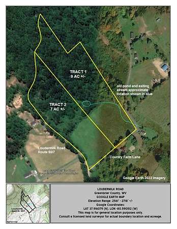 HIGHLIGHTS *Country Farm Lane Tract 1 consists of 9 acres +/- and contains about 2.5 acres of field and about 6.5 acres of forestland *Access is provided with about 270 feet of frontage on Country Farm Lane and about 375 feet of frontage on Loudermilk Road *A mixture of rolling pasture and mature timberland with numerous home sites *Surrounded by farms and timberland in a nice rural neighborhood *30 minutes to the 70,000-acre New River National Gorge National Park *Located in highly desirable Greenbrier County *The property's privacy and rural character have broad appeal *Convenient to Interstate 64 for quick access to Lewisburg and Beckley *State maintained paved roads - FedEx, UPS and USPS delivery *The area is blessed with a 4-season climate *Mature timber species include oaks, walnut, poplar, maple and hickories *Fur bearing wildlife - deer, bear, squirrel, rabbit, bobcat, raccoon, fox, opossum *Winged wildlife - eagles, hawks, owls, ravens, turkeys and Neotropical songbirds *The trees, fields, and a variety of other plants produce life-giving Oxygen and store Carbon dioxide *Plenty of space for incorporating a permaculture experience *Perfect for recreational activities including shooting sports, ATV riding, horseback riding, hiking, camping, hunting and nature viewing *Low taxes, low population density *Long-range views of mountains and valleys from upper elevations of the property *Very quiet: Little light pollution offers the opportunity for incredible star gazing *The county nature of the property provide an exceptional quality of life *Minutes to Lewisburg's jet airport with flights to Chicago & Washington DC *20 minutes to Walmart, Lowes, a hospital, fast food, fine dining, most anything else *Cellphone coverage is excellent *Elevation Range: 2561? to 2718' *Proximity to the Greenbrier River, 2000-acre Bluestone Lake and the New River, offer a gateway to water recreation Lewisburg, the seat of Greenbrier County, is 20 minutes away. Often described as an ideal small town, Lewisburg offers fine dining, boutique shops, galleries, a golf course, an 8-screen cinema and a lively arts scene at Carnegie Hall and the Greenbrier Valley Theatre. Annual events include the State Fair of West Virginia in nearby Fairlea, food-themed street festivals, literary festival, Christmas, New Years, and MLK day parade. The town is home to the West Virginia School of Osteopathic Medicine, and a campus of New River Community and Technical College. The Greenbrier, in White Sulphur Springs, is one of the world's top luxury resorts. The hotel's offerings include multiple golf courses, a spa, a tennis complex, a casino, boutique shopping, an artist colony, and 10 restaurants. Many of its amenities are open to the public. The nearby Greenbrier River and New River draw anglers and kayakers, and the 75-mile Greenbrier River Trail is popular with hikers and bicyclists. Snowshoe Ski Resort is the largest ski complex in the Mid-Atlantic States, and offers extensive mountain biking trails and numerous festivals and special events in the off-season. FOREST/TIMBER RESOURCES The forest's well-drained upland terrain has led to a resource dominated by hardwood species. Overall, the species composition is highly desirable and favors Appalachian hardwood types, consisting primarily of Black Walnut, Sugar Maple, Poplar/Basswood, Red Oak Group, White Oak/Chestnut Oak, Soft Maple, Hickory, and a host of associated species (sourwood, black gum, beech). The predominant timber stand contains 20-140-year-old trees ranging in size of 10"-40" dbh. A few "Heritage Trees" are scattered throughout the forest and old field edges. These ancient trees, some 100-200 years old, have withstood the test of time, weathering ice, wind, lightning strikes and fire.
