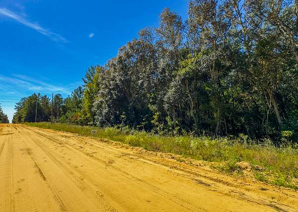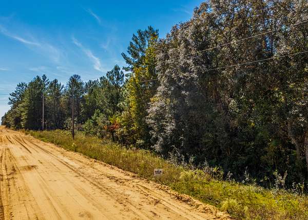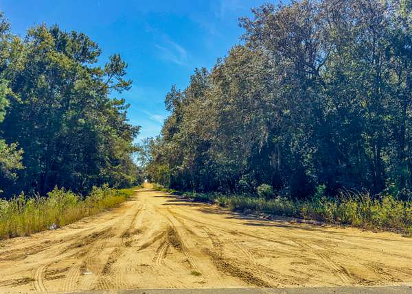 The road that fronts the property is a maintained dirt road, providing straightforward access to the lot while maintaining the natural setting.