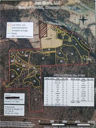 Hunting and recreational dream property - unique opportunity to purchase 211.33 acres in beautiful Chenango County. Diverse mix of hardwood(maple,cherry, birch, oak) and pine, as well as a beautiful open hillside offering great views of the surrounding landscape. Wildlife abounds on this hunting paradise with excellent deer and turkey results as well as a 1,620 feet of frontage along Gilmoure Brook for additional recreational opportunities. Property also features fantastic hillside and panoramic views as well as a producing spring on the open field. 179 acres managed thru the NYS 480a Forestry Management Program - in addition to the potential for ongoing income thru the forestry program, the property offers significantly reduced annual property tax obligations giving the opportunity to own in excess of 200 acres at a low annual cost basis. If searching for large parcels with diverse opportunities for recreation and future income potential through periodic timber harvesting, please consider the long-term investment return and low property taxes offered through the 480a program. Please copy the link below to your browser for more information on the 480a program: . Less than one mile to State Hwy 12 and the amenities of the charming small-town community of Norwich, NY.