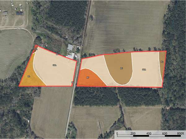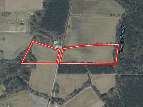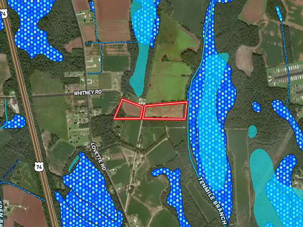 None of the property is within the FEMA 100 year or 500 year floodplain. Furthermore, there are no designated wetlands present. The Tenmile Branch creek runs through the woods, near the eastern border of the property, making it an area that deer, turkey and other wildlife are likely to visit. The sandy soil is mostly flat and has good drainage on the front and sides of the fields. With a little grading and grass seed, a beautiful yard is just waiting for you.