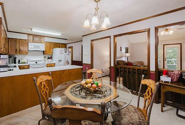 Nestled on 7 private wooded acres, this 3-bedroom, 2-bath home offers peaceful country living with timeless character and endless potential. The spacious living room features vaulted ceilings, exposed beams, and a cozy brick fireplace, creating a warm and inviting gathering space. Enjoy a separate formal dining room, large windows overlooking the trees, and a functional kitchen ready for your personal updates. The oversized primary suite includes a double vanity, soaking tub, and walk-in shower, while the large deck provides the perfect spot to relax and enjoy the serene surroundings. Property also includes a basement workshop/garage space, ideal for hobbies or storage and the crawl space has been professionally encapsulated for added peace of mind. A rare opportunity to own acreage with privacy, space, and room to make it your own. Home to be sold as-is.