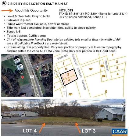 Prime investment opportunity on East Main Street in Waynesboro! These two side-by-side buildable lots (Lots 3 & 4) total approx. 0.258 acres and are being sold together. Level, cleared, and easy to build, the site offers easy public water/sewer access, power at the street, and a sidewalk already in place. Zoned L-B Limited Business, this location allows a wide range of residential and commercial uses including single-family homes, duplexes, short-term rentals, offices, clinics, shops, and restaurants, with conditional uses such as multi-family, assisted living, or daycare. Title work is clean and the property is ready for a quick close. Situated along Waynesboro's growing East Main corridor--just minutes from downtown, I-64, and Shenandoah National Park--this property offers high visibility, excellent access, and strong long-term potential. Ideal for investors, builders, or business owners seeking to join Waynesboro's ongoing wave of development and economic growth.