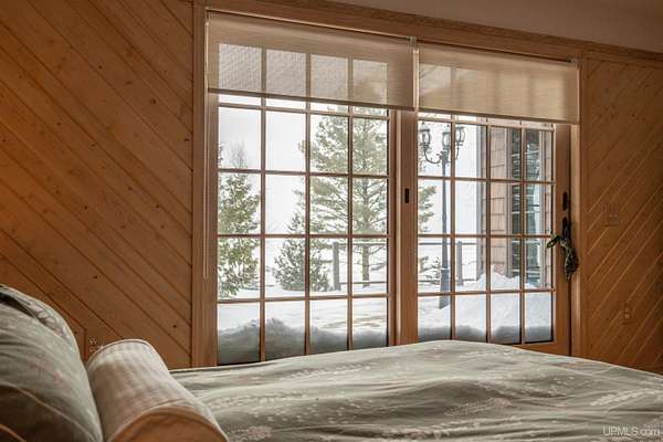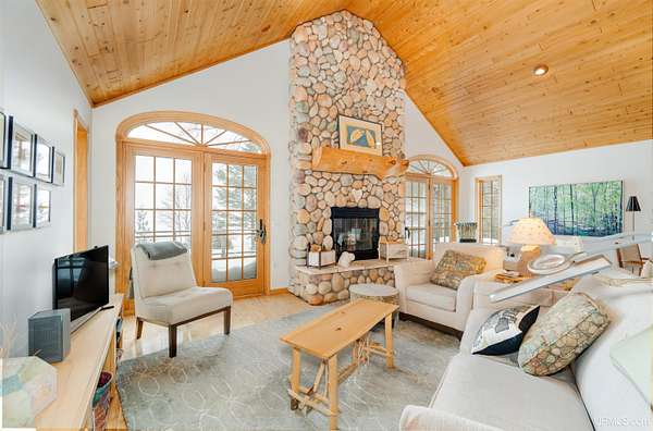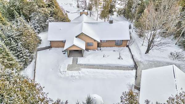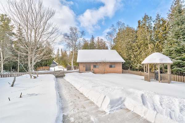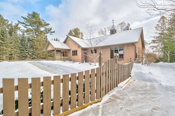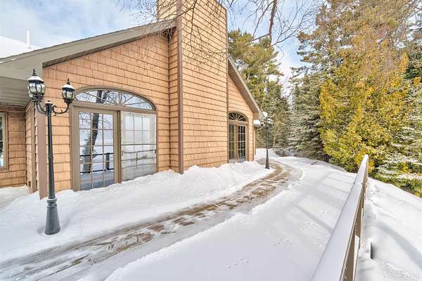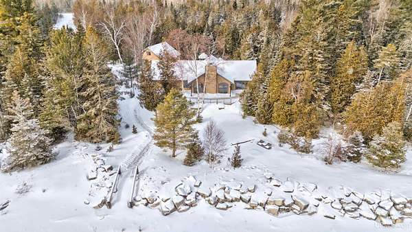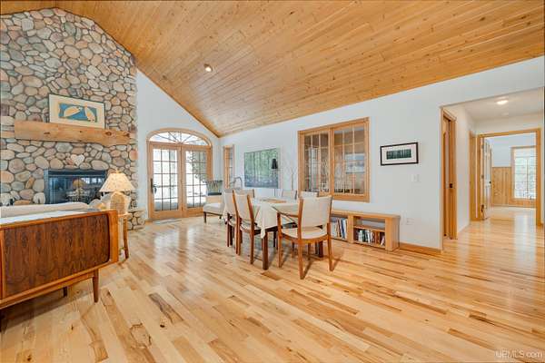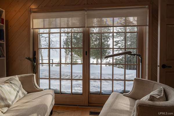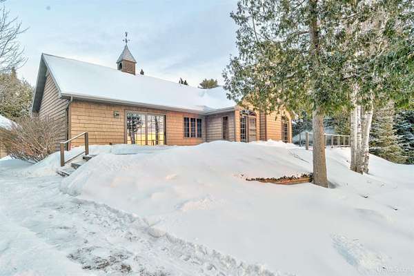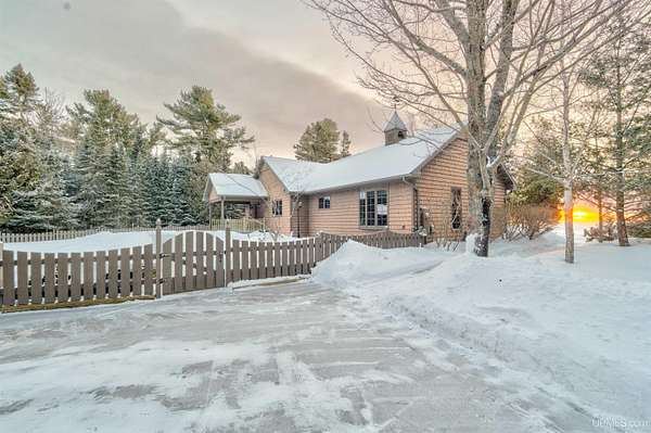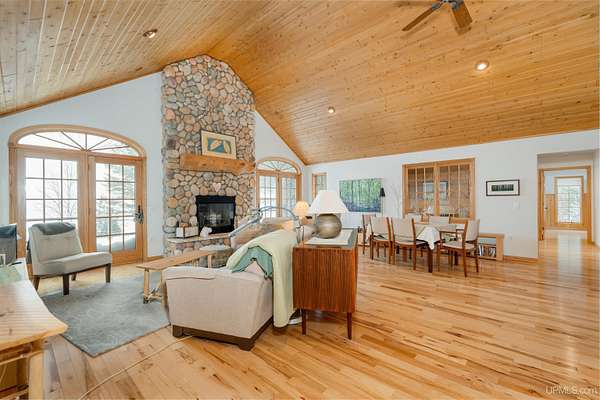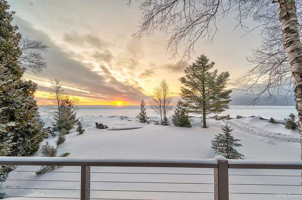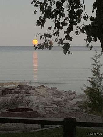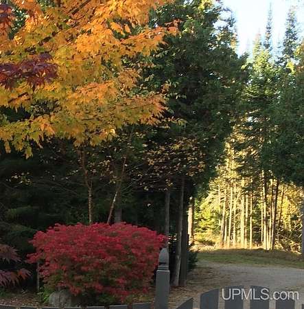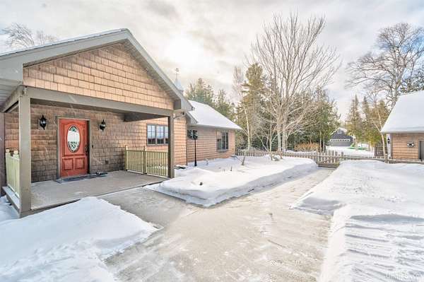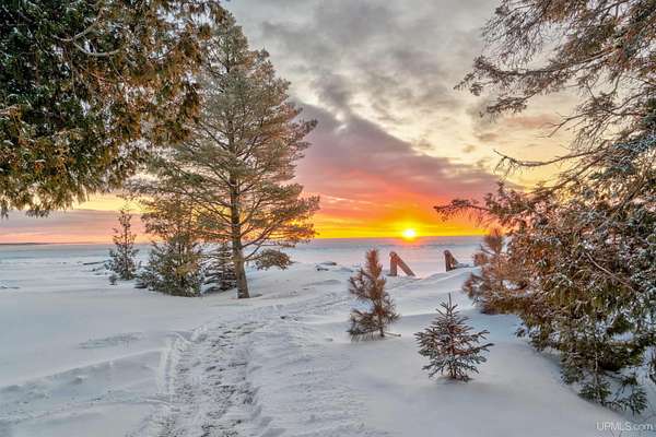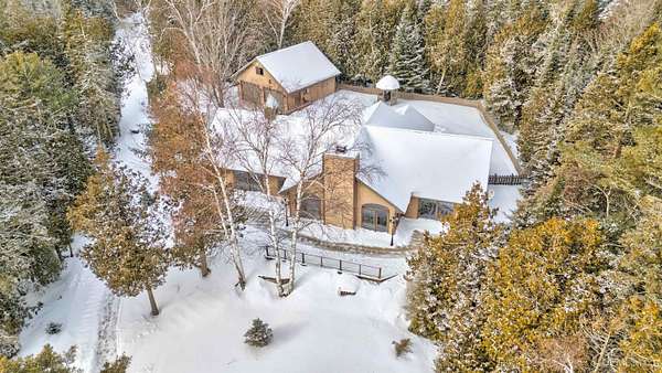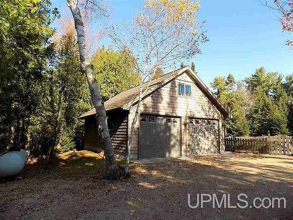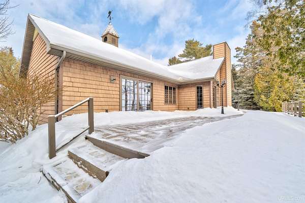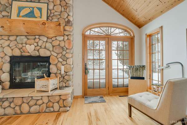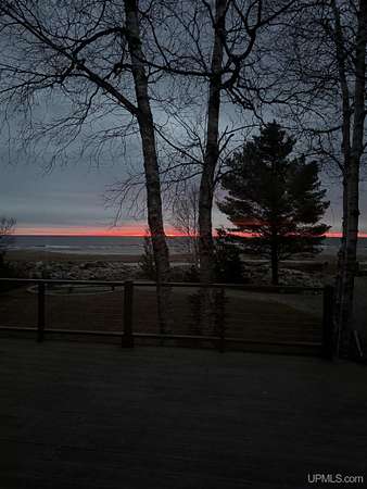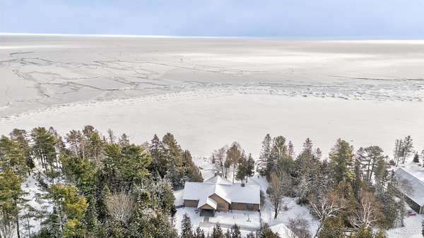 A beautiful escape awaits you on the north shore of Lake Michigan. This inviting 1,800 sq ft ranch-style home sits on 2.84 acres with approximately 200 feet of Lake Michigan shoreline, offering breathtaking sunrise views and a peaceful natural setting that brings serenity and tranquility to everyday life. Accessed via a private road and conveniently located just a few miles from town and the local hospital, the home features beautiful hickory hardwood floors, white cedar tongue-and-groove cathedral ceilings, creating an open and welcoming atmosphere. A stunning floor-to-ceiling stone chimney and wood-burning fireplace serves as a warm and inviting focal point in the living area. The home features three bedrooms, two full bathrooms, and a dedicated office, ideal for remote work or a quiet retreat. The kitchen is both stylish and functional, showcasing rich hickory cabinetry, quartz countertops, and marble-patterned luxury vinyl tile flooring that offers durability with timeless appeal. The primary bathroom features a neutral quartz countertop, while the second bathroom is finished with a porcelain countertop, both complemented by luxury vinyl tile flooring for easy maintenance. Quality Andersen windows and doors enhance the home's design while providing excellent protection from the elements. The crawl space includes a full concrete slab with storage and is deep enough for easy access and maintenance. Outside, the exterior is just as impressive with low-maintenance Trex decking, a limestone breakwall to protect during periods of extreme high water. Above the detached two-car garage, you'll find a bonus woodworking shop ideal for hobbies, projects, or additional storage. The property is set within a beautifully wooded landscape of cedar and white birch trees, enhanced by established perennial flower gardens that add seasonal color and charm. Just minutes away, the waterfront community of Manistique offers a lively downtown with shops, bars and restaurants, hiking trails, a public marina, and a wide range of year-round amenities. Whether you're seeking a year-round residence or a serene lakeside retreat, this exceptional property offers privacy, space, and unforgettable Lake Michigan views in a truly special setting.