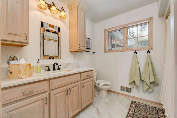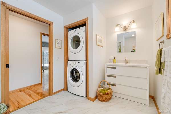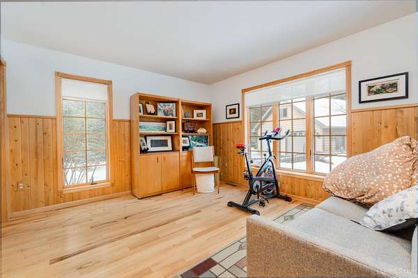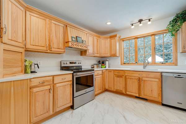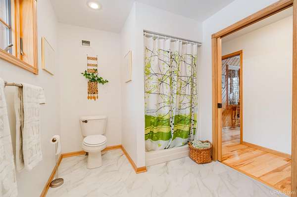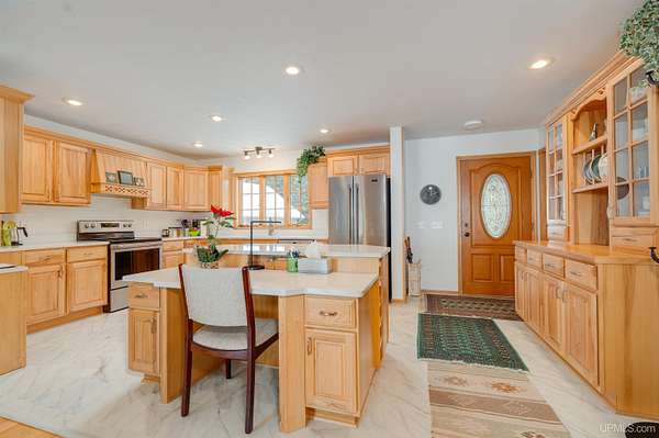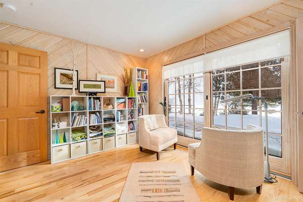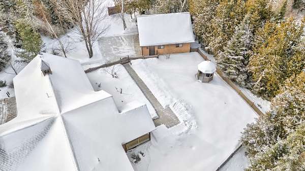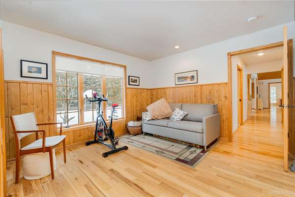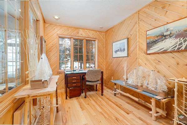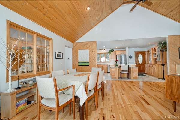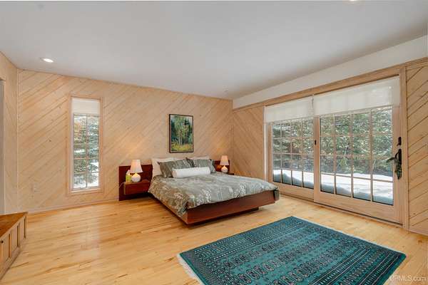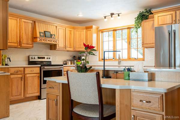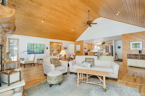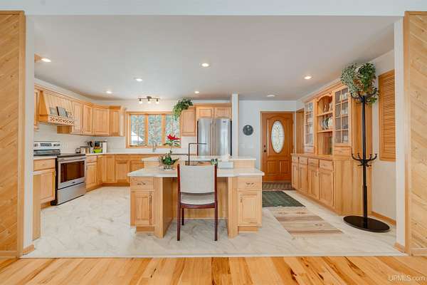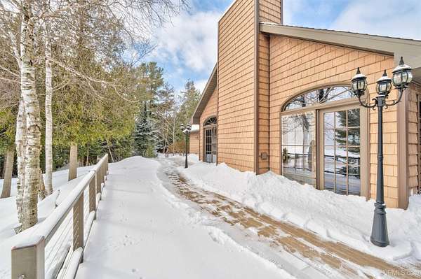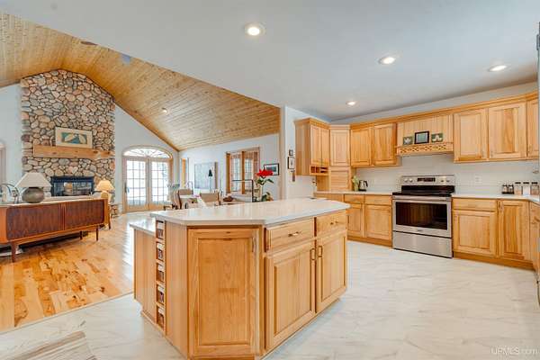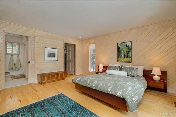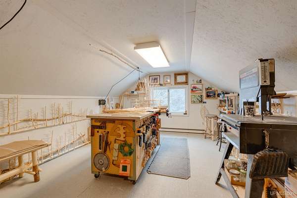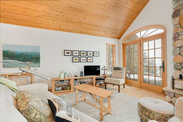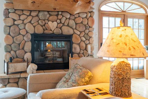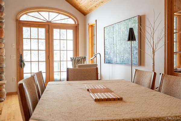A beautiful escape awaits you on the north shore of Lake Michigan. This inviting 1,800 sq ft ranch-style home sits on 2.84 acres with approximately 200 feet of Lake Michigan shoreline, offering breathtaking sunrise views and a peaceful natural setting that brings serenity and tranquility to everyday life. Accessed via a private road and conveniently located just a few miles from town and the local hospital, the home features beautiful hickory hardwood floors, white cedar tongue-and-groove cathedral ceilings, creating an open and welcoming atmosphere. A stunning floor-to-ceiling stone chimney and wood-burning fireplace serves as a warm and inviting focal point in the living area. The home features three bedrooms, two full bathrooms, and a dedicated office, ideal for remote work or a quiet retreat. The kitchen is both stylish and functional, showcasing rich hickory cabinetry, quartz countertops, and marble-patterned luxury vinyl tile flooring that offers durability with timeless appeal. The primary bathroom features a neutral quartz countertop, while the second bathroom is finished with a porcelain countertop, both complemented by luxury vinyl tile flooring for easy maintenance. Quality Andersen windows and doors enhance the home's design while providing excellent protection from the elements. The crawl space includes a full concrete slab with storage and is deep enough for easy access and maintenance. Outside, the exterior is just as impressive with low-maintenance Trex decking, a limestone breakwall to protect during periods of extreme high water. Above the detached two-car garage, you'll find a bonus woodworking shop ideal for hobbies, projects, or additional storage. The property is set within a beautifully wooded landscape of cedar and white birch trees, enhanced by established perennial flower gardens that add seasonal color and charm. Just minutes away, the waterfront community of Manistique offers a lively downtown with shops, bars and restaurants, hiking trails, a public marina, and a wide range of year-round amenities. Whether you're seeking a year-round residence or a serene lakeside retreat, this exceptional property offers privacy, space, and unforgettable Lake Michigan views in a truly special setting.