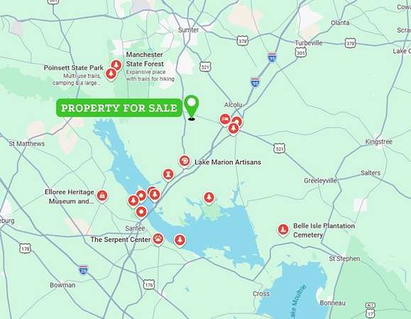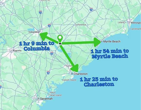 Located approximately 13 minutes from downtown Manning providing grocery stores, medical services, schools, and restaurants, the property balances rural privacy with town convenience. Sumter sits roughly 24 minutes away for expanded shopping and healthcare, while Columbia is approximately 1 hour 12 minutes distant for major hospitals, universities, and cultural attractions. Central South Carolina offers mild winters, long outdoor seasons, and access to recreation including Santee State Park, Swan Lake Iris Gardens, and multiple lakes and wildlife areas within driving distance. The region provides a slower pace of life while maintaining connectivity to essential services.