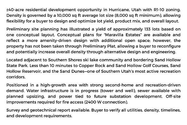 +/-40-acre residential development opportunity in Hurricane, Utah with R1-10 zoning. Density is governed by a 10,000 sq ft average lot size (8,000 sq ft minimum), allowing flexibility for a buyer to design and optimize lot yield, product mix, and overall layout. Preliminary site planning has illustrated a yield of approximately 133 lots based on one conceptual layout. Conceptual plans for ''Maravilla Estates'' are available and reflect a more amenity-driven design with additional open space; however, the property has not been taken through Preliminary Plat, allowing a buyer to reconfigure and potentially increase overall density through alternative design and engineering. Located adjacent to Southern Shores ski lake community and bordering Sand Hollow State Park. Less than 10 minutes to Copper Rock and Sand Hollow Golf Courses, Sand Hollow Reservoir, and the Sand Dunes--one of Southern Utah's most active recreation corridors. Positioned in a high-growth area with strong second-home and recreation-driven demand. Water infrastructure is in progress (tower and well), sewer available with planned upsizing, and power tied to future substation development. Off-site improvements required for fire access (2400 W connection). Survey and geotechnical report available. Buyer to verify all utilities, density, timelines, and development requirements.